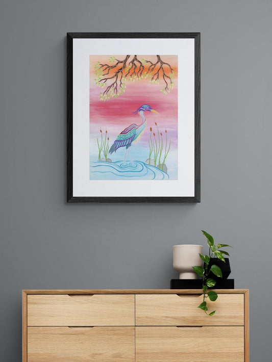 Blue Heron By Patrick Hunter Indigenous Art Print, First Nations, Ojibway, Native Americans Indian Decor, Framed Art