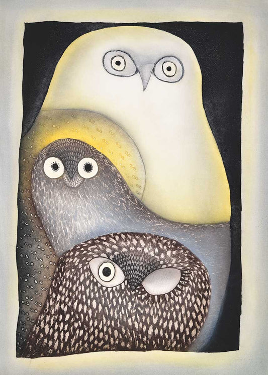 Owls Of The Night, 1990l by Pitaloosie Saila, Inuit Art Card, Framed Art Card