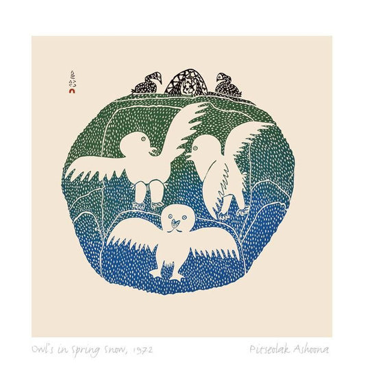 Owls In Spring Snow, 1972 by Pitseolak Ashoona, Inuit Art Card, Framed Art Card