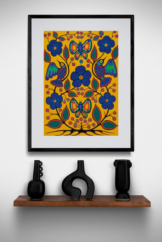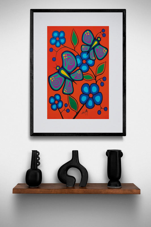 Butterflies And Flowers by Jim Oskineegish Indigenous Art Print, First Nations, Ahnisnabae Culture, Native American Indian Decor