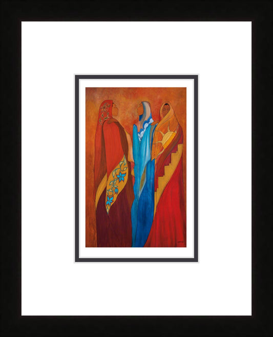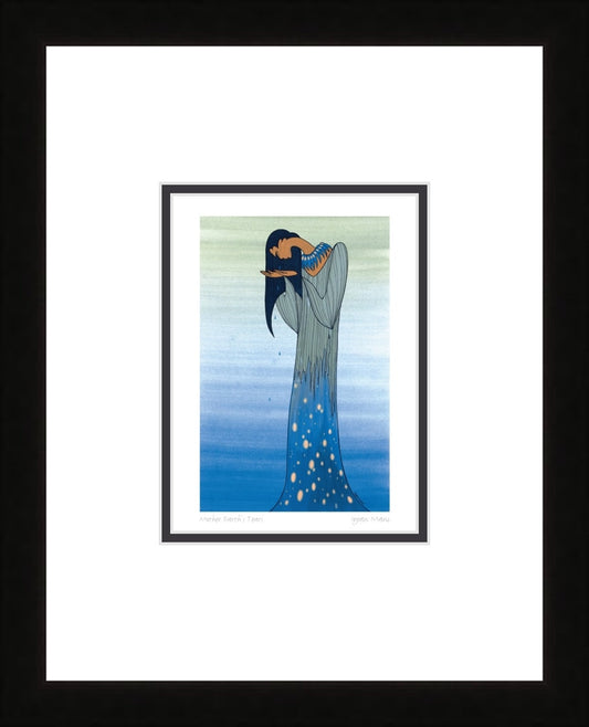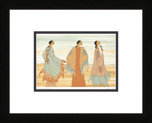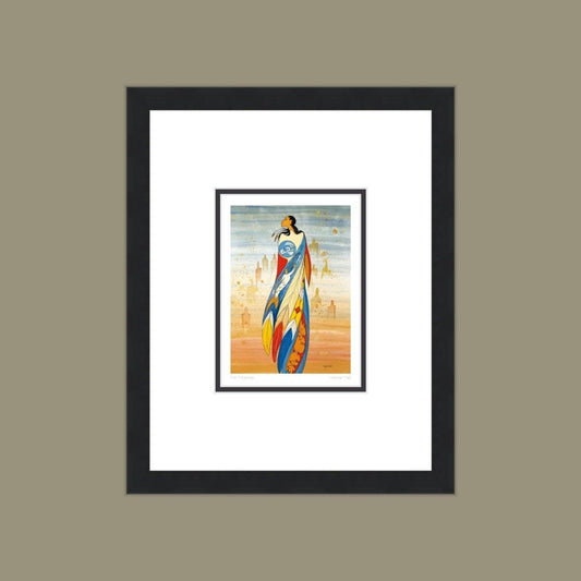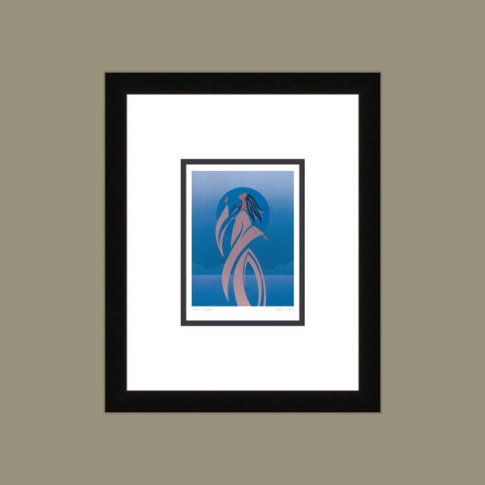 Maxine was born in Manitoba of Santee Oglala Sioux parents. She spent her early childhood on her mother’s reserve but at the age of six she left to attend an Indian residential school. Maxine’s early career as a legal secretary was soon overshadowed by her preoccupation with painting and drawing. She took a course in advanced design where a teacher noticed Maxine’s tendency toward linear expression and encouraged her in the use of shape and line to suggest movement. She learned those lessons well, as evidenced by much of her work today. Since those early days Maxine has mastered the skills of painting and drawing plus the processes of serigraphy, etching and stone lithography. Recently she has turned her talents to the creation of editions in cast paper and limited edition bronze castings.