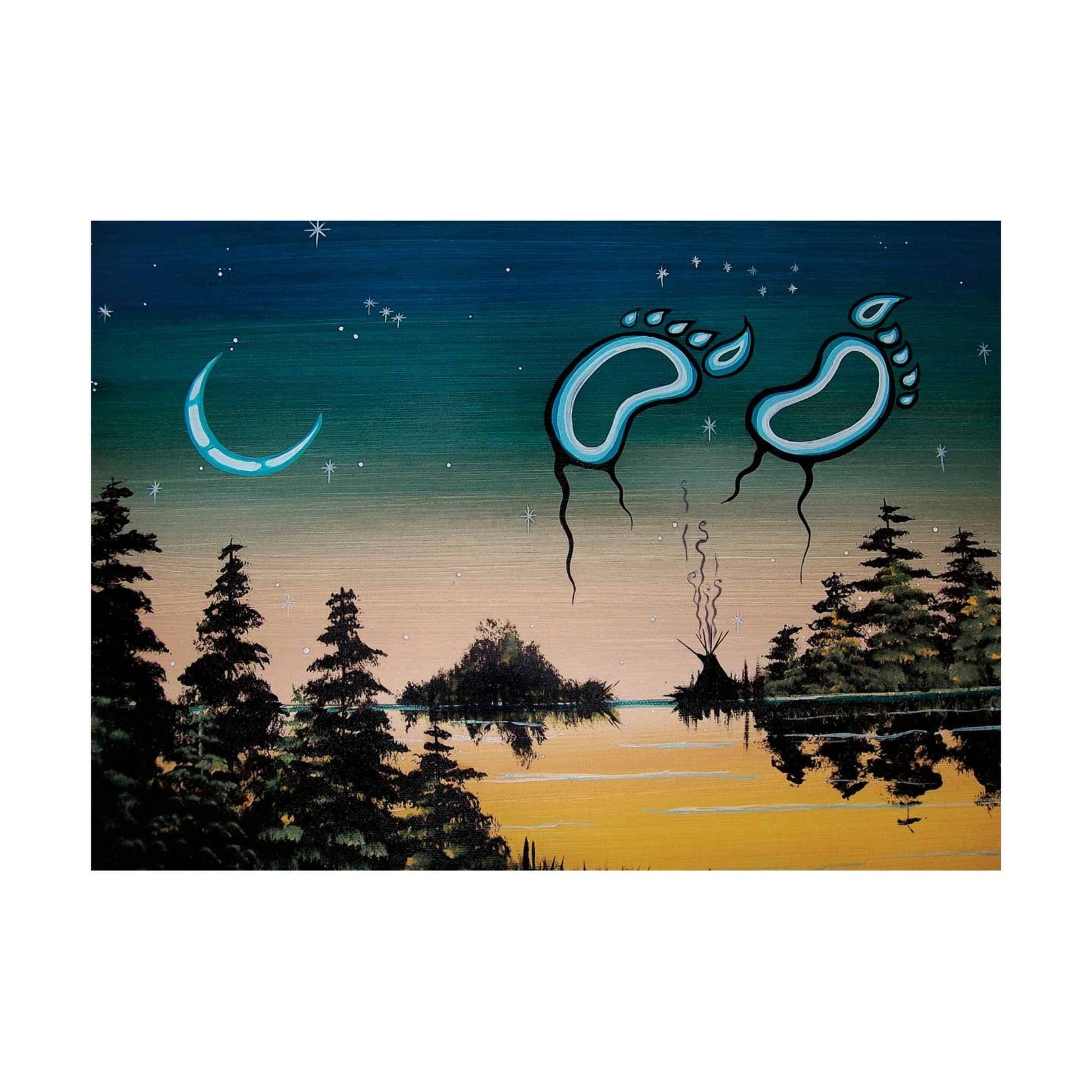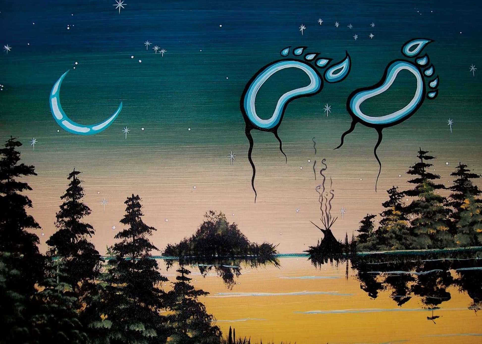 The self-taught Beausoleil First Nation artist, William Anthony Monague, grew up on an isolated island with no access to formal education or training in the arts. Monague – “Abwaudung” (The Visionary or Dreamer) discovered inspiration in the traditional teachings of Mother Earth, Spirit World and in the beauty of nature and in the Georgian Bay shores that surrounded him. Initially he was using the woodland style but soon developed his own more contemporary style of art. During the 1970’s and 80’s Monague followed the Pow Wow circuit in a van with his family down to Mexico. His work ended up in various museums and galleries along the way. Monague donates his time and artwork to many worthwhile causes, while helping others. “I feel my art speaks to my culture. I have made a name for myself with my work and reputation but it has taken a long time.” After 45 years of painting, he continues his artistic lifelong journey with his family.