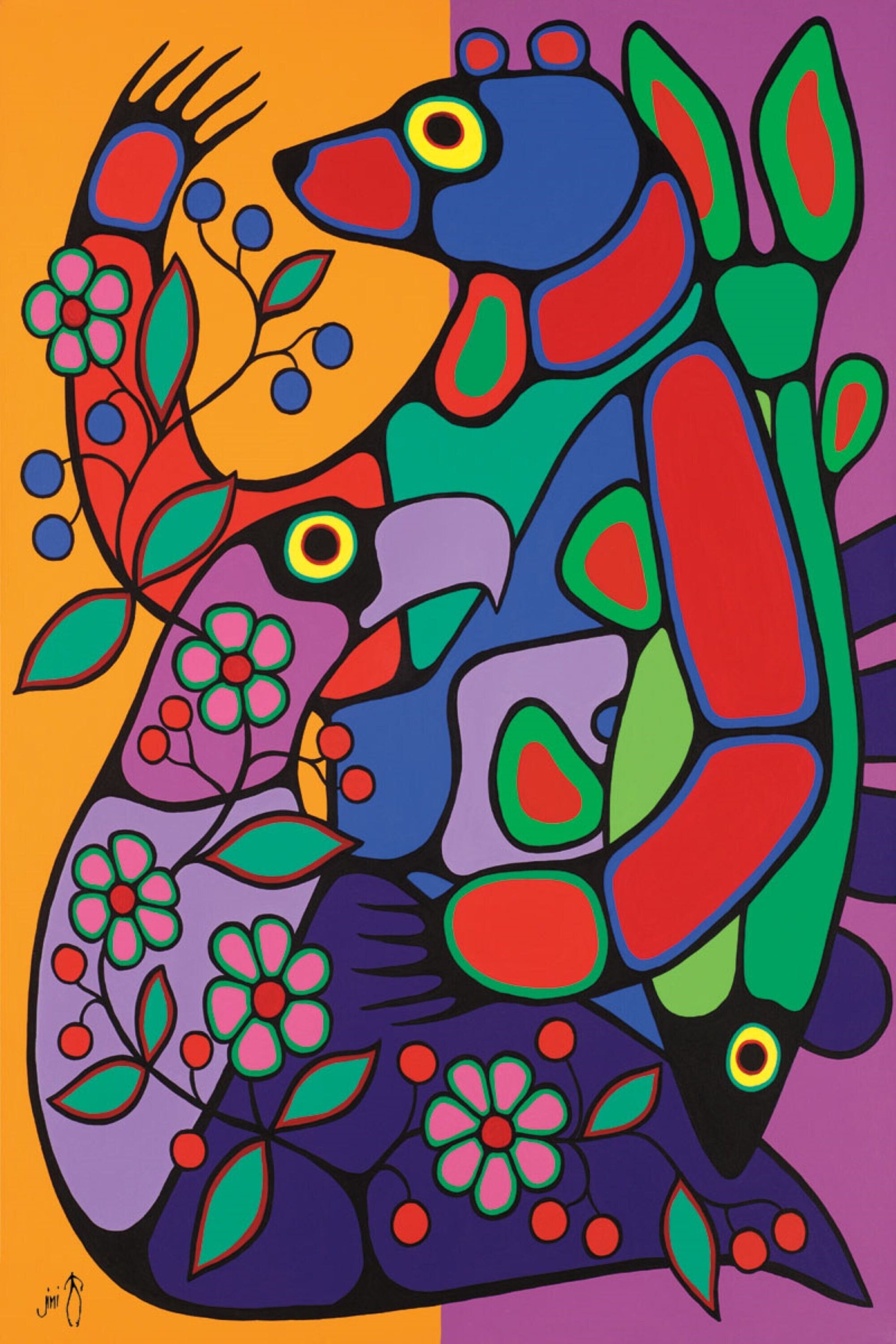 Jim Oskineegish is an Ojibwe artist who is a registered member of the Eabametoong First Nation which is located in northwestern Ontario, Canada. Jim paints in the Shamanistic Woodland Style using bold lines and bright colors. He loves to paint legends and stories of his people and hopes that his art can bridge a universal understanding of love, faith, and unity. “I want to promote positive Ahnisnabae culture to the world.”