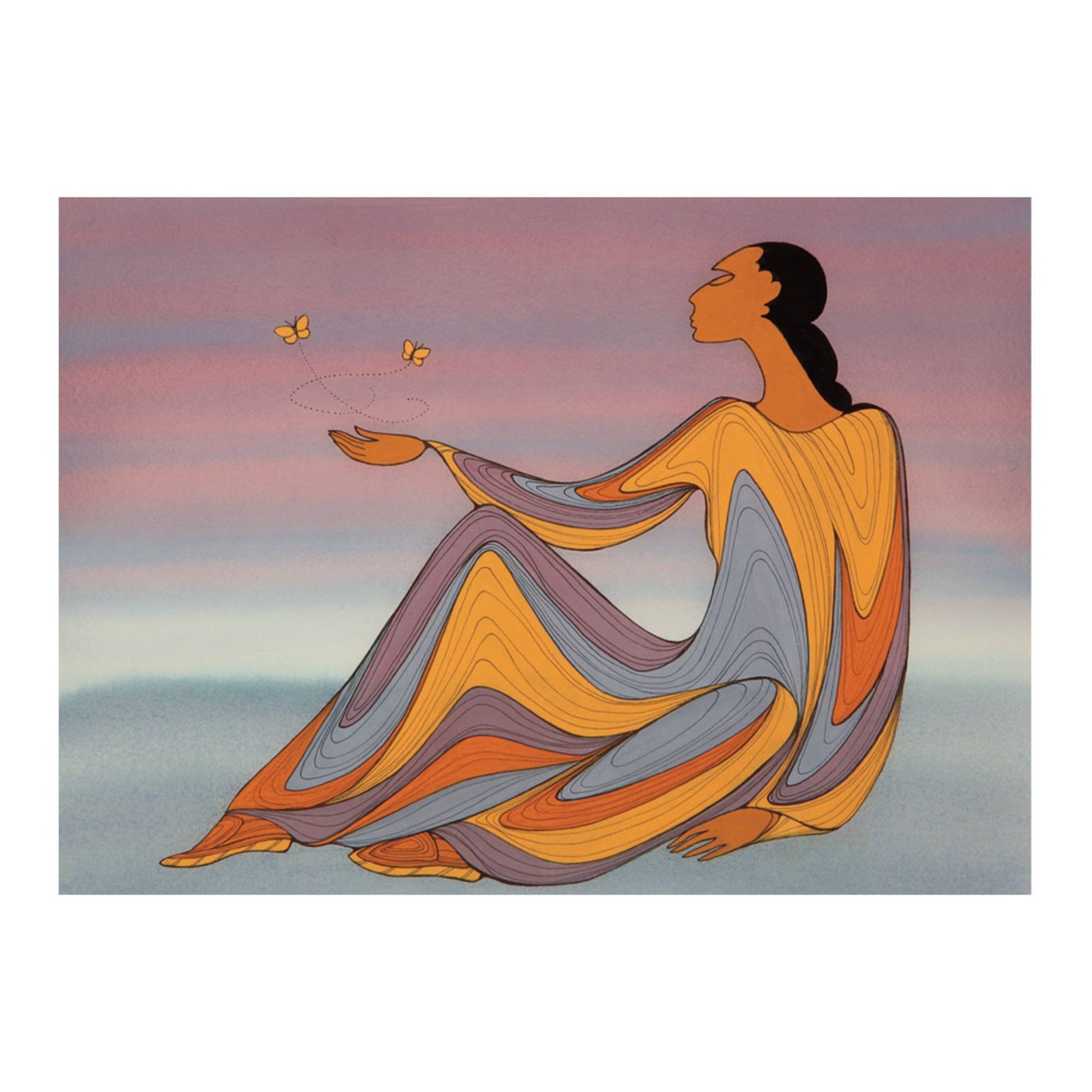 Maxine was born in Manitoba of Santee Oglala Sioux parents. She spent her early childhood on her mother’s reserve but at the age of six she left to attend an Indian residential school. Maxine’s early career as a legal secretary was soon overshadowed by her preoccupation with painting and drawing. She took a course in advanced design where a teacher noticed Maxine’s tendency toward linear expression and encouraged her in the use of shape and line to suggest movement. She learned those lessons well, as evidenced by much of her work today. Since those early days Maxine has mastered the skills of painting and drawing plus the processes of serigraphy, etching and stone lithography. Recently she has turned her talents to the creation of editions in cast paper and limited edition bronze castings.