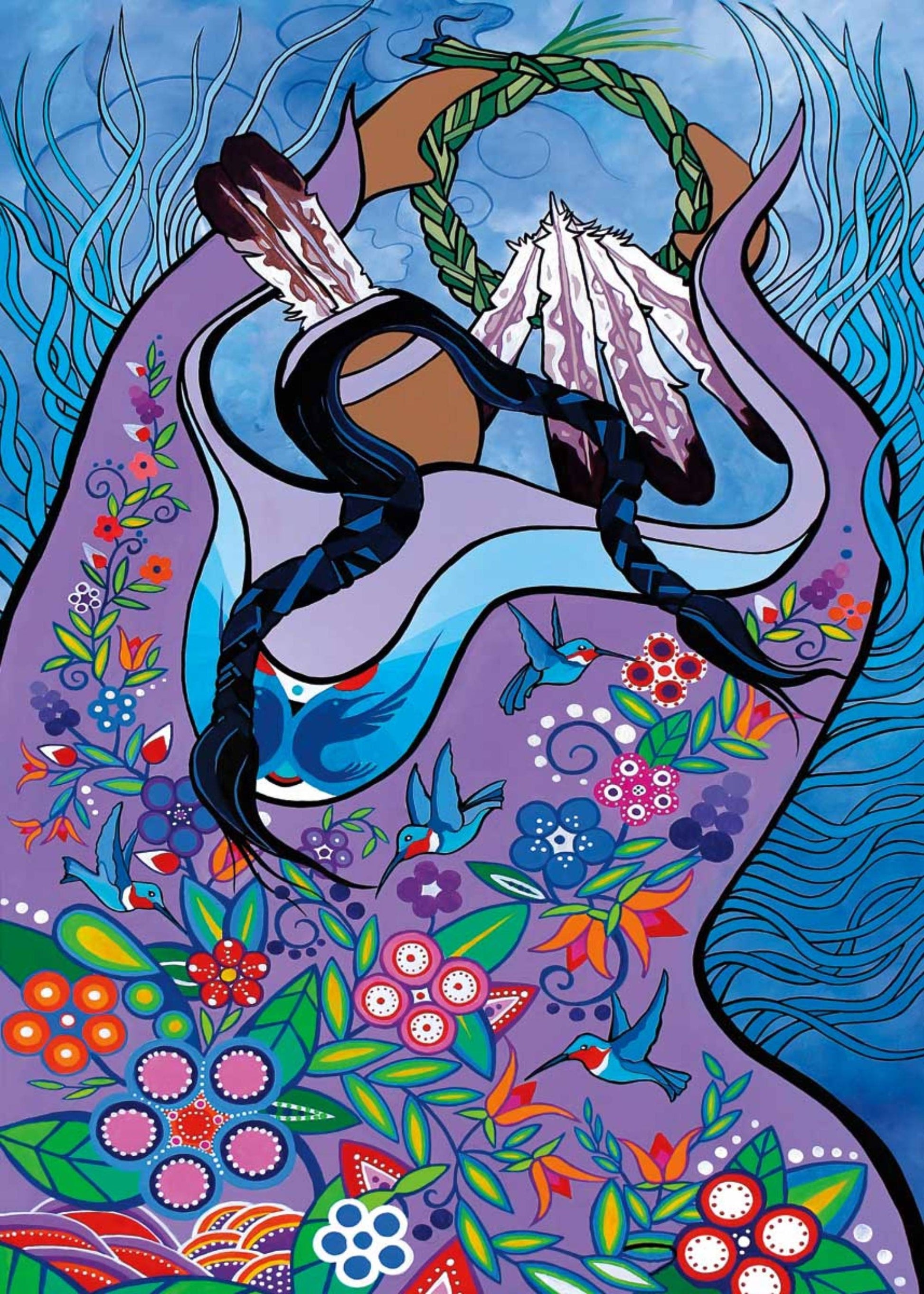 Pamela Cailloux was born in Chibougamau Québec. She is of Métis decent consisting of Huron and Algonquin heritage. Her artwork is heavily influenced by the teachings of the medicine wheel consisting of balance, seasons, elements and harmony. Mother earth is often represented in her works as an energy and spirit that is determined to heal and restore natural order. Pamela has been drawing all her life and the style we see today, began to take shape around 1995.