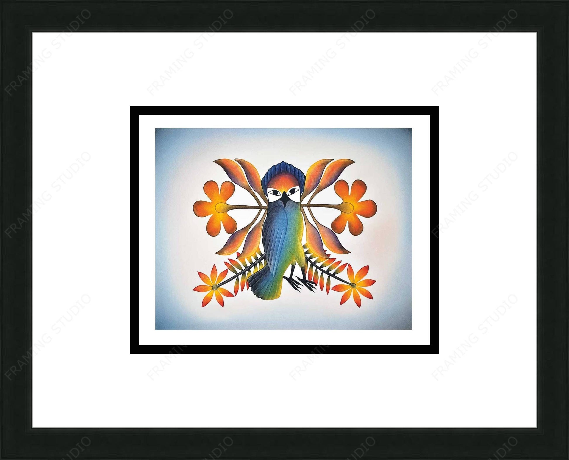 Framed Outside Finished Size: 16 X 13, Double Mat, 1.25” Black Wood Frame, Finished Backing with Wire Hanger and Artist's bio on the back.