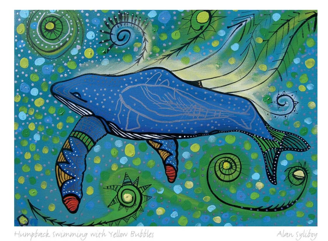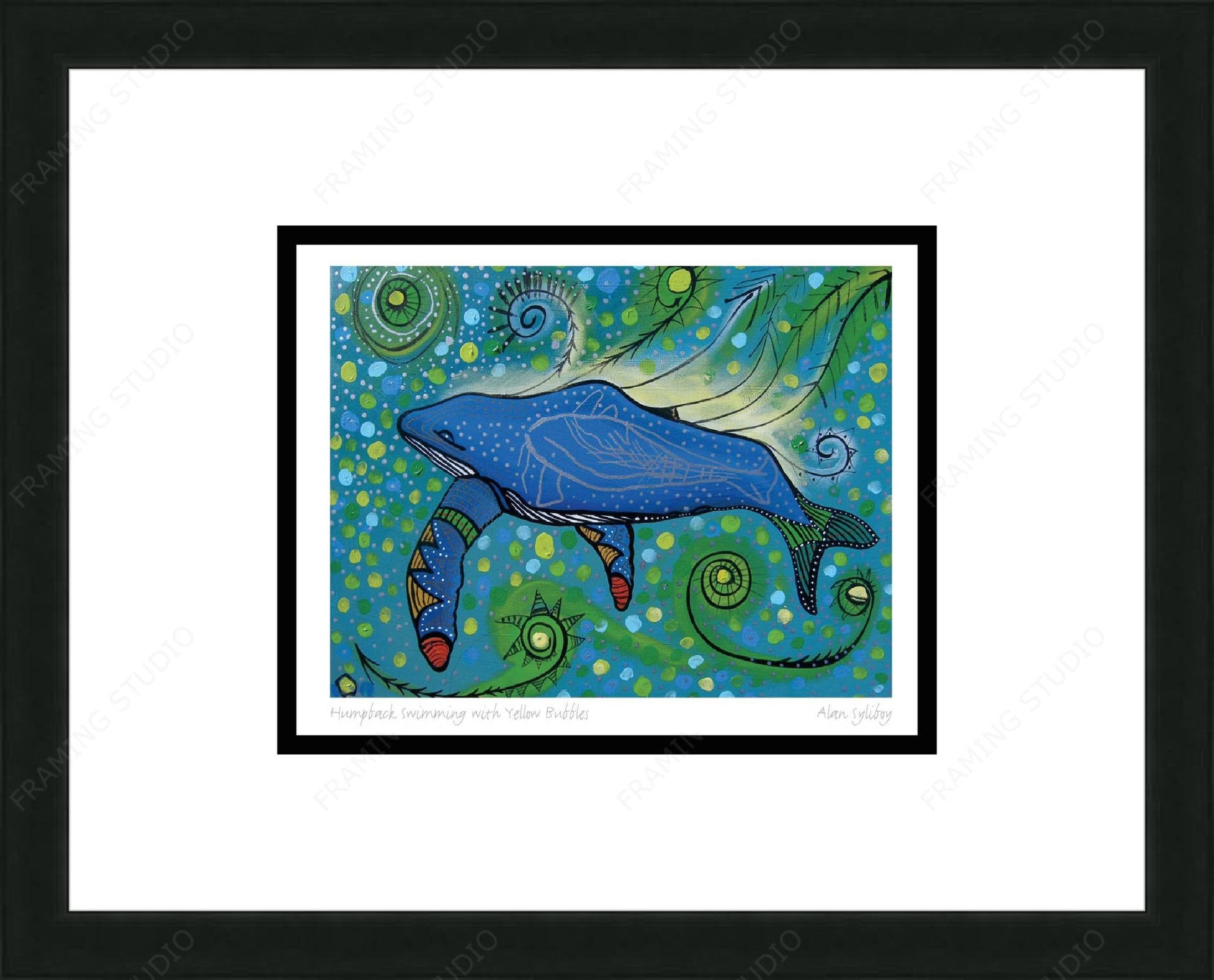 Humpback Swimming With Yellow Bubbles by Alan Syliboy, Indigenous Art Card, Framed Art Card, Mi’kmaq Artist