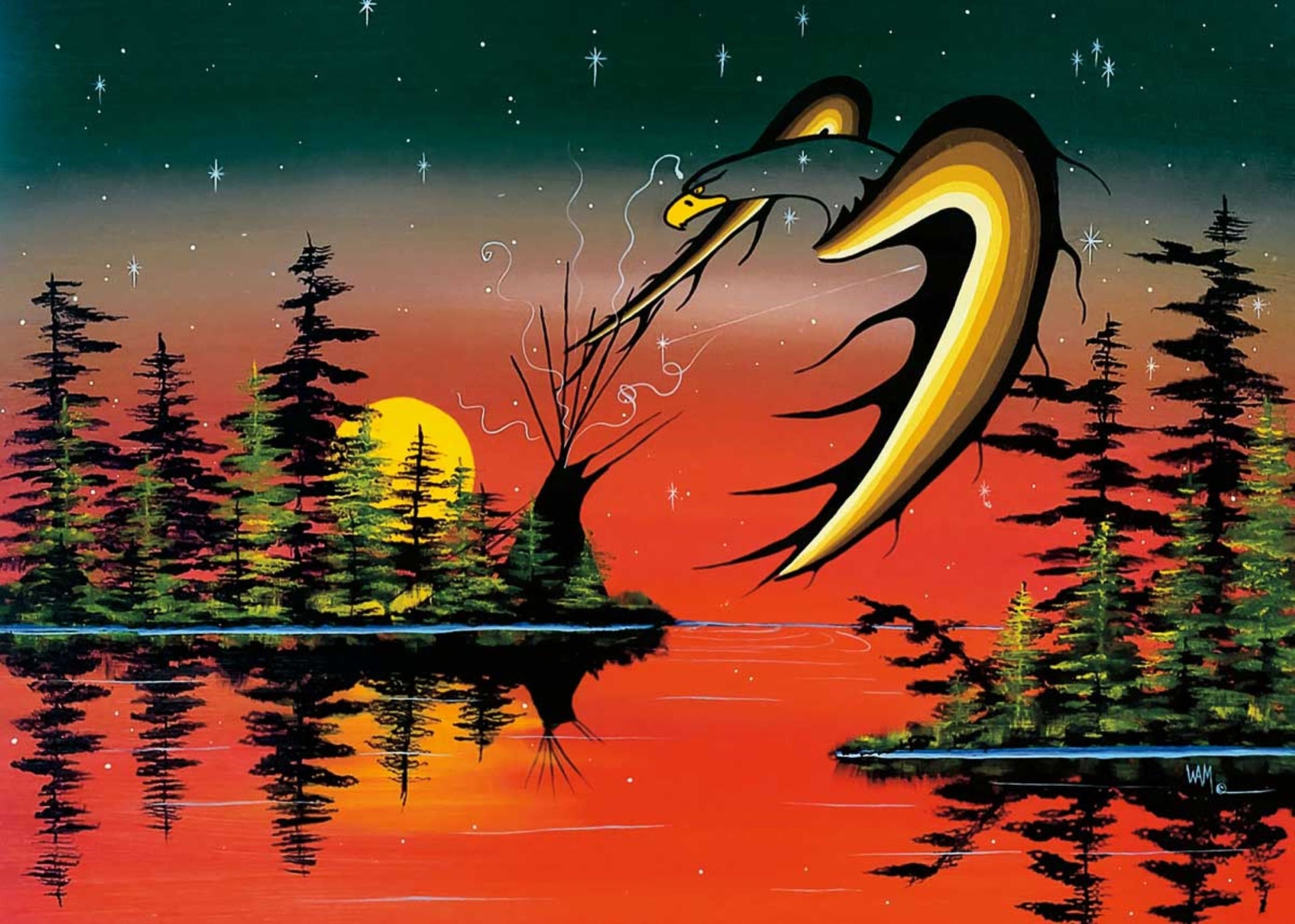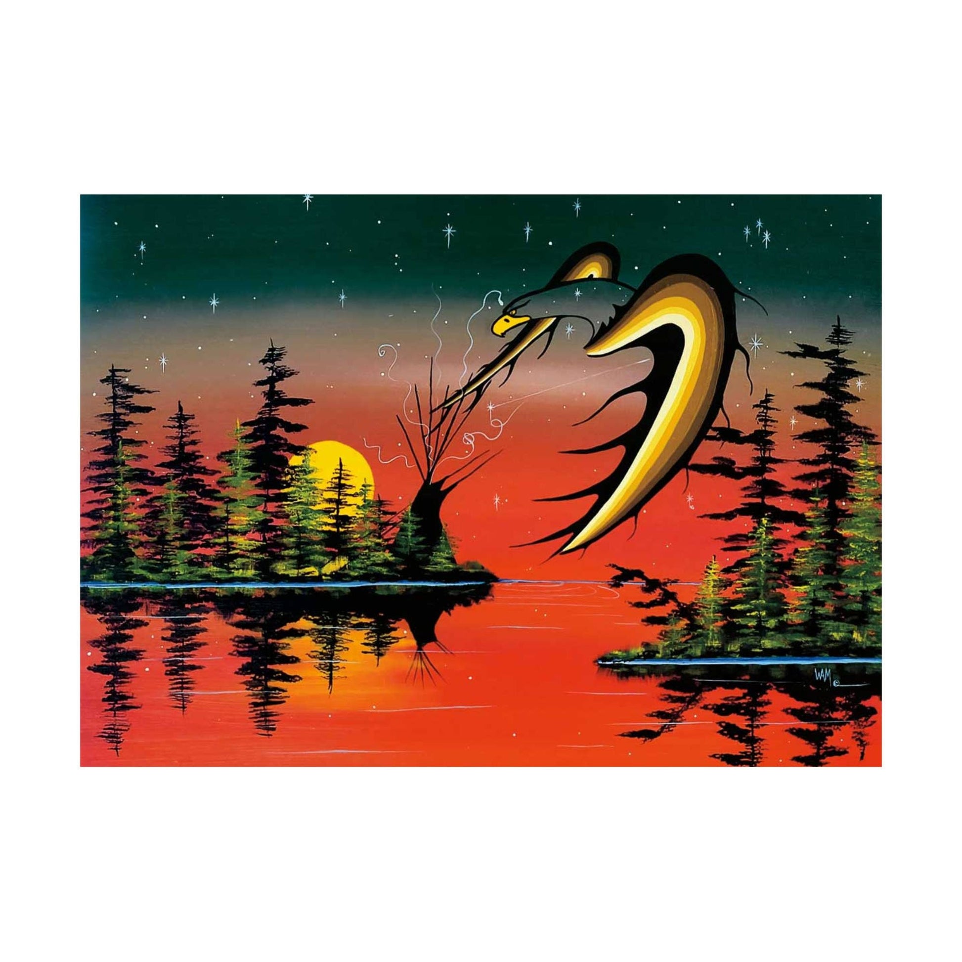 The self-taught Beausoleil First Nation artist, William Anthony Monague, grew up on an isolated island with no access to formal education or training in the arts. Monague – “Abwaudung” (The Visionary or Dreamer) discovered inspiration in the traditional teachings of Mother Earth, Spirit World and in the beauty of nature and in the Georgian Bay shores that surrounded him. Initially he was using the woodland style but soon developed his own more contemporary style of art. During the 1970’s and 80’s Monague followed the Pow Wow circuit in a van with his family down to Mexico. His work ended up in various museums and galleries along the way. Monague donates his time and artwork to many worthwhile causes, while helping others. “I feel my art speaks to my culture. I have made a name for myself with my work and reputation but it has taken a long time.” After 45 years of painting, he continues his artistic lifelong journey with his family.