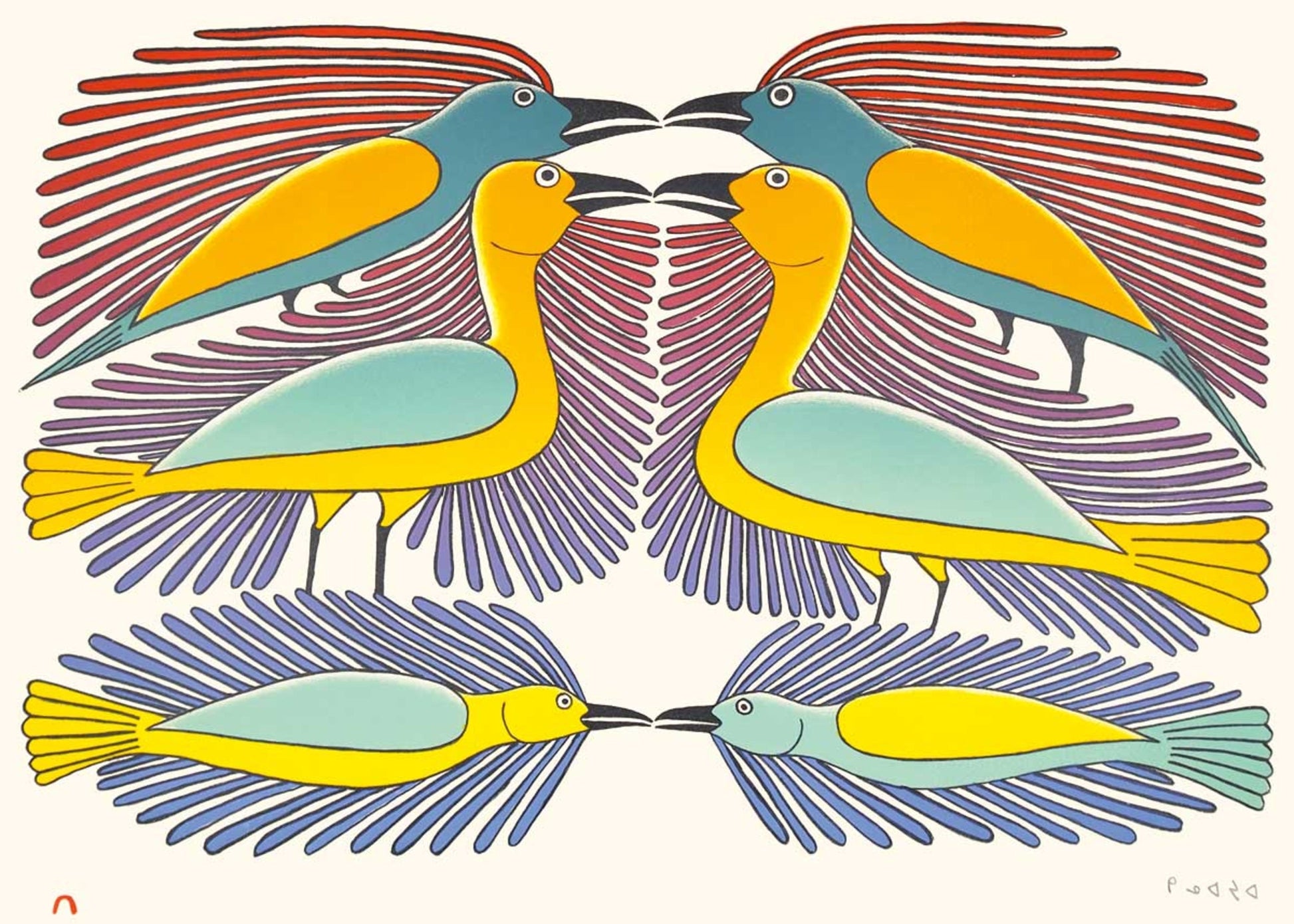 Kenojuak first began experimenting with drawing and stone carving in the late 1950s. Her early work appeared in the Cape Dorset Annual Graphics Collections, launching a career that would include numerous national and international commissions, special projects and exhibitions. Her life and art have been the subject of a film produced by the National Film Board of Canada, and a book entitled “Graphic Arts of the Inuit: Kenojuak”, published in 1981.