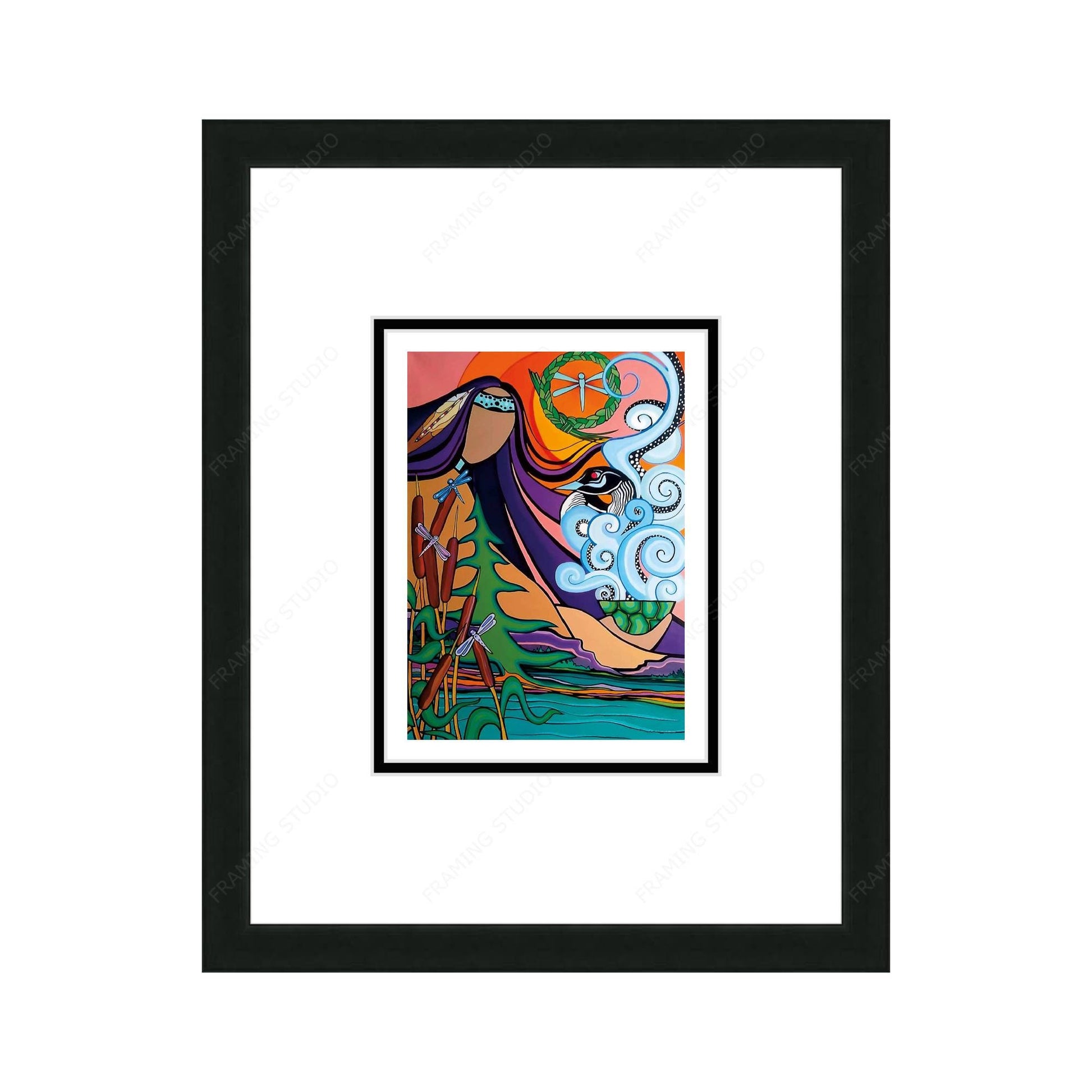 Framed Outside Finished Size: 13 X 16, Double Mat, 1.25” Black Wood Frame, Finished Backing with Wire Hanger and Artist's bio on the back.
