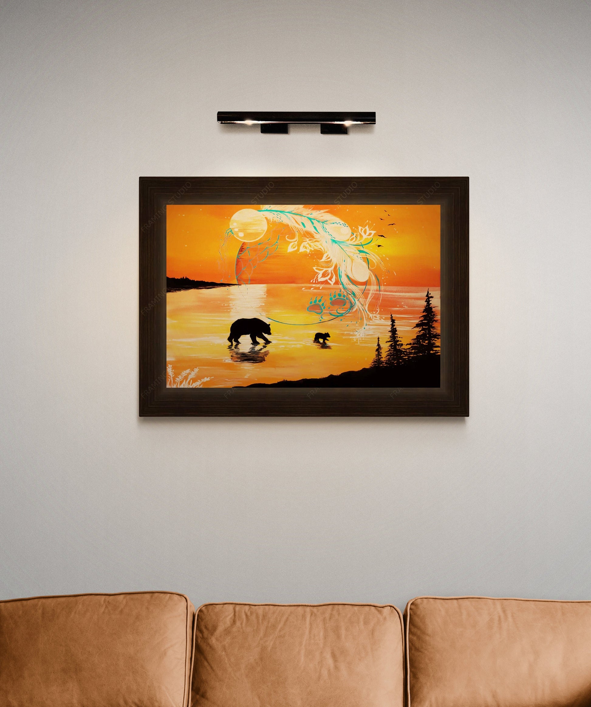 Framed Print (no mat) - Outside Finished Size 22" X 16" Mounted on masonite with protective coating and framed in a dark walnut, textured, polystyrene frame. Backing with Wire Hanger.