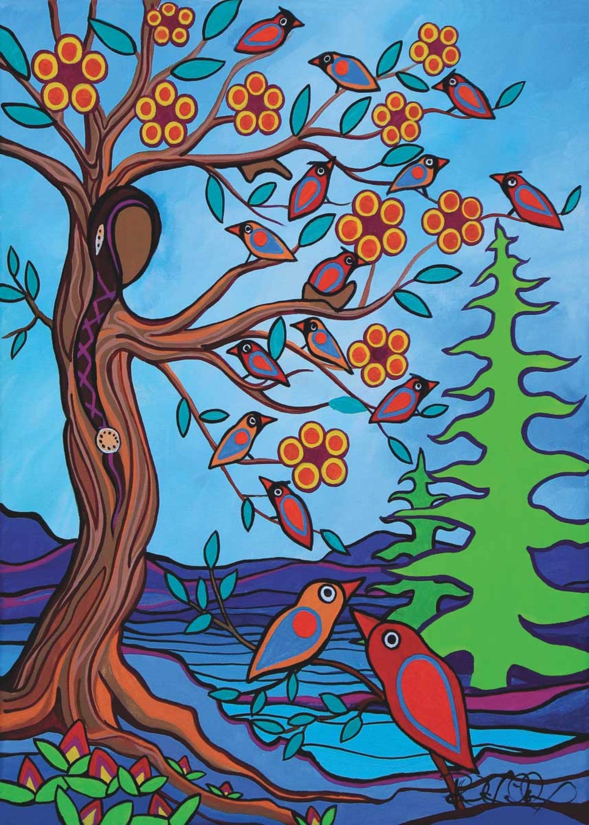 Mother Earth With Her Birds by Pam Cailloux, Indigenous Art Card, Framed Art Card, Métis Artist
