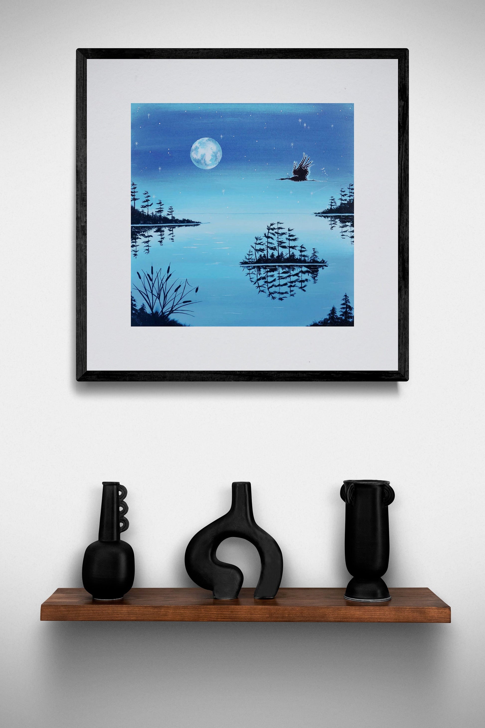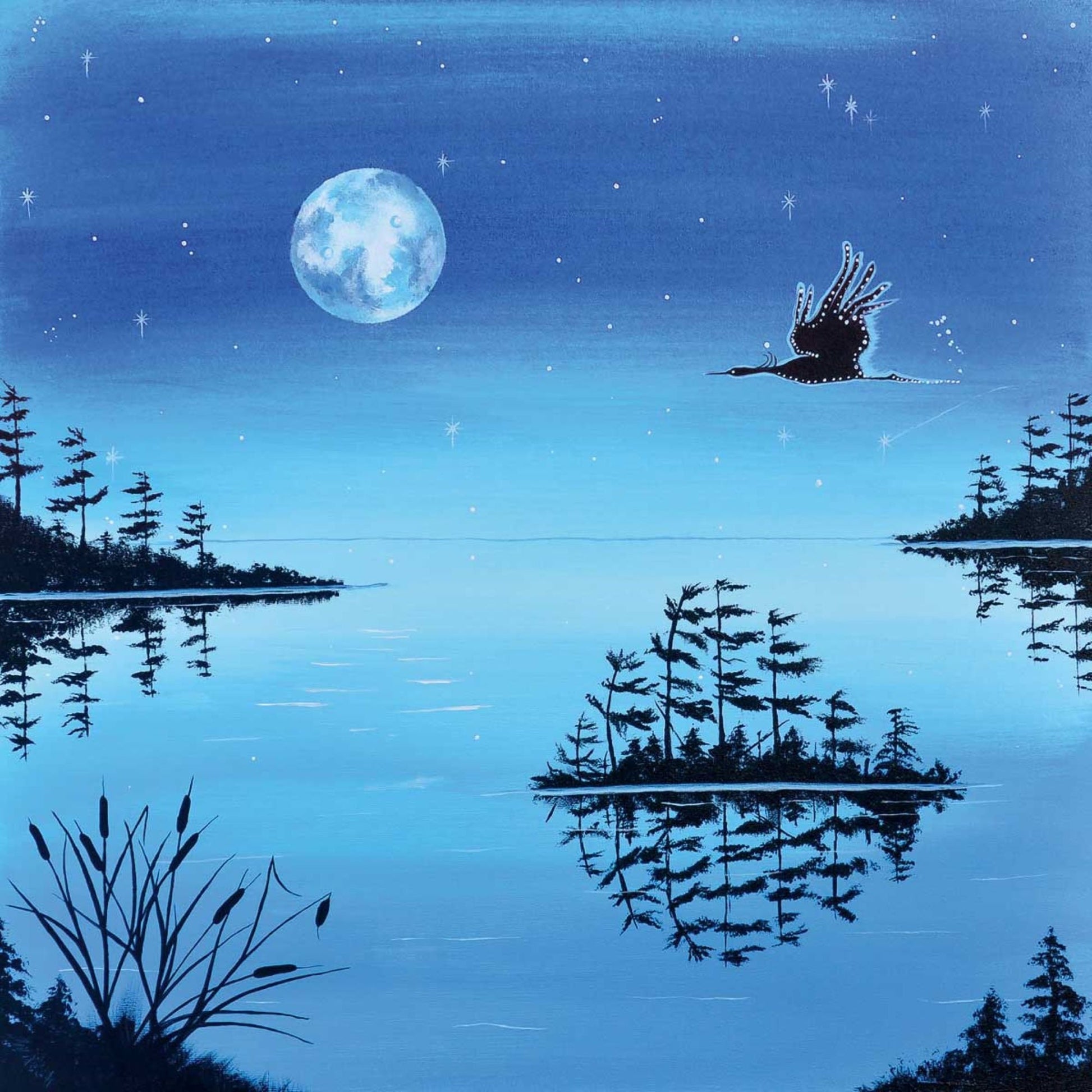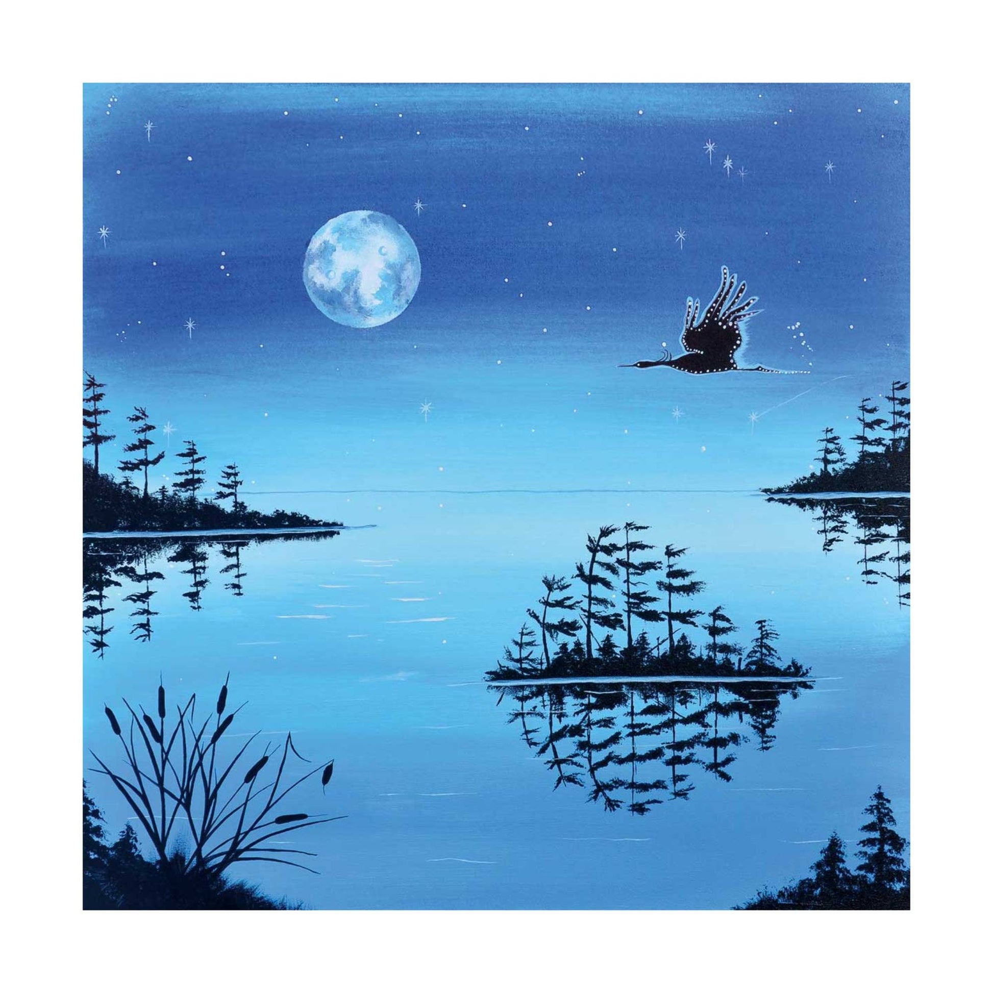 Night Flight – Blue Heron By William Monague, Indigenous Art Print, First Nations, Ojibway, Native Americans Indian Decor, Framed
