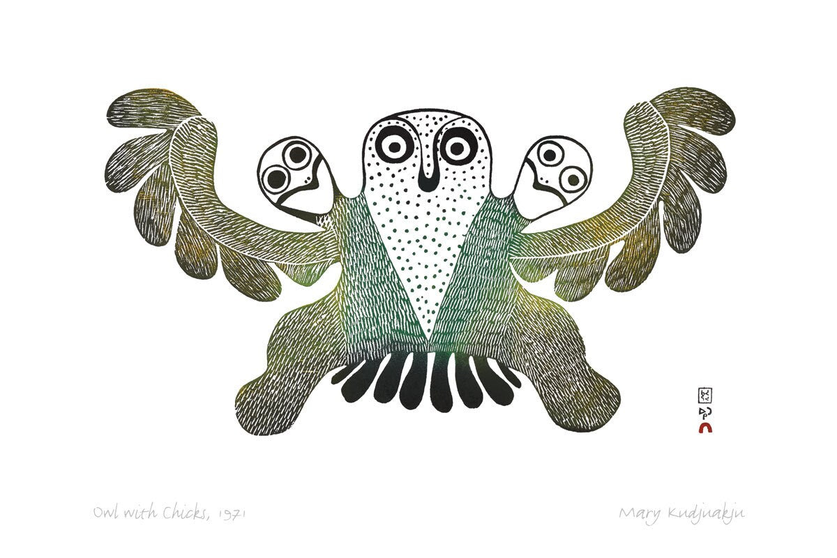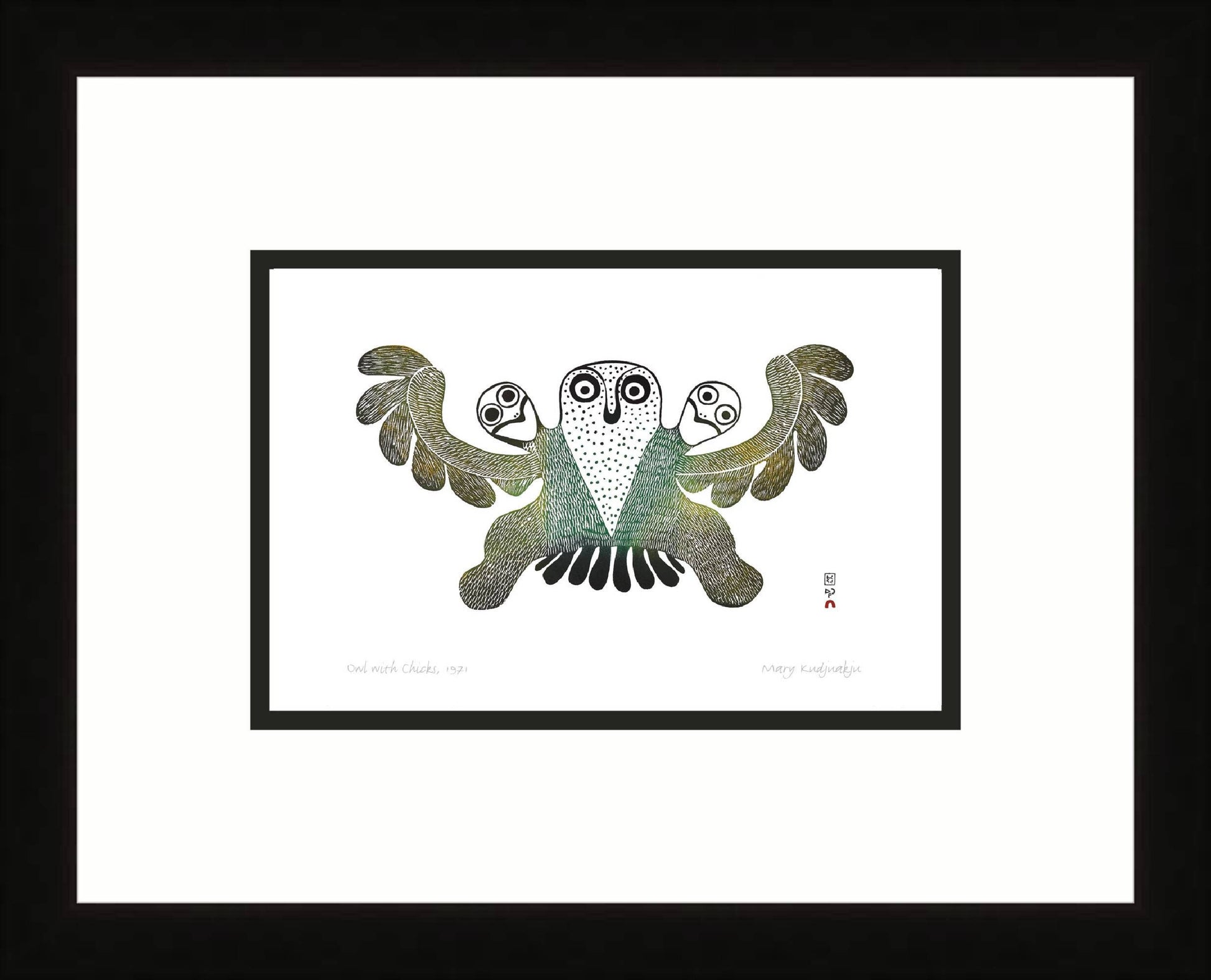 Owl With Chicks, 1971 by Mary Kudjuakju (1908 - 1982), Inuit Art Card, Framed Art Card