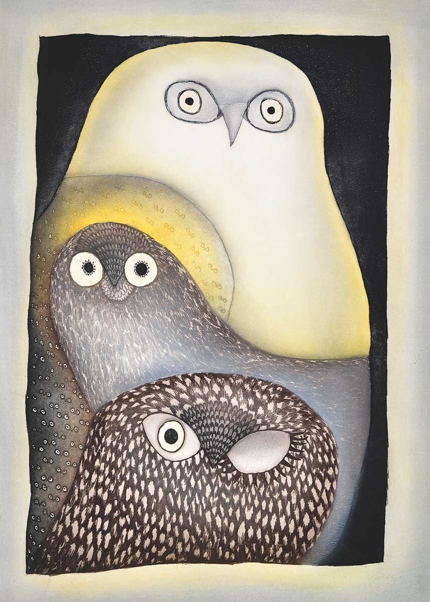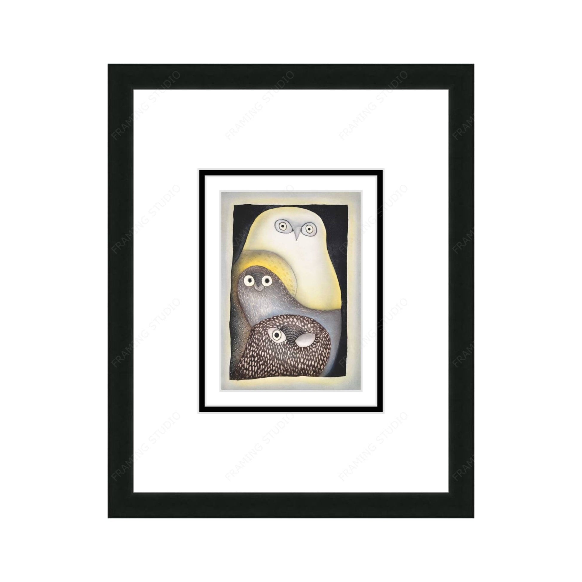 Owls In Moonlight by Ningiukulu Teevee,, Indigenous Art Card, Inuit Framed Art Card