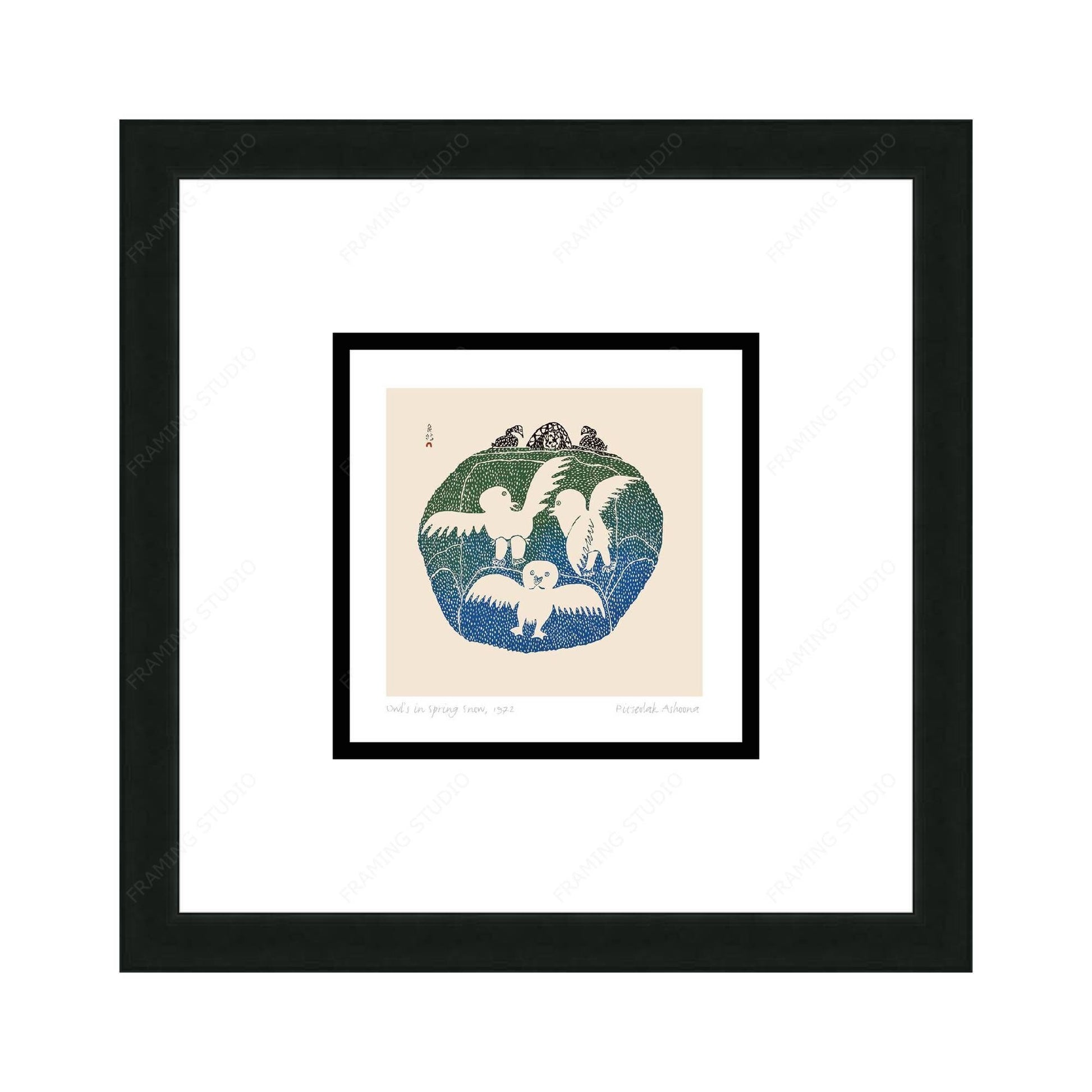 Owls In Spring Snow, 1972 by Pitseolak Ashoona, Inuit Art Card, Framed Art Card