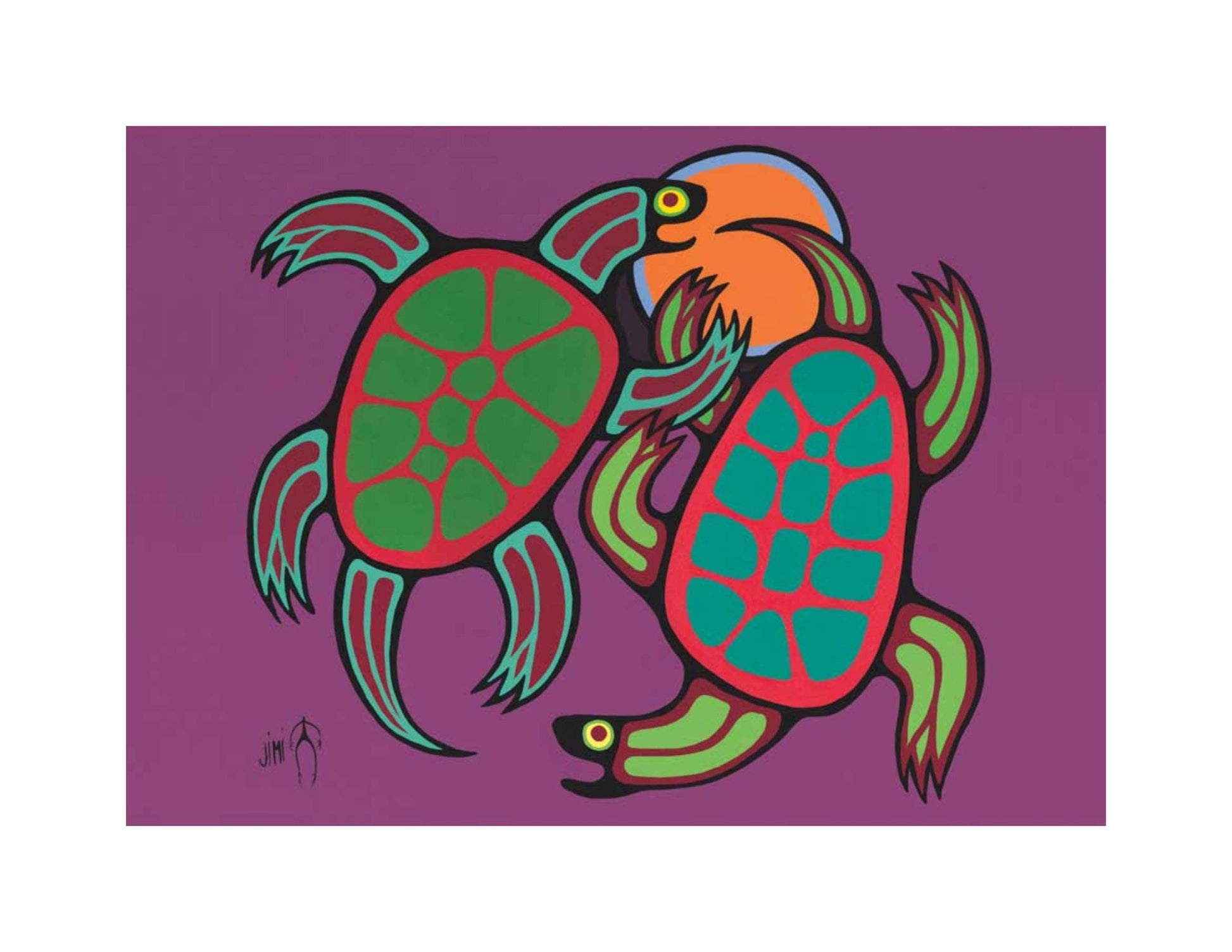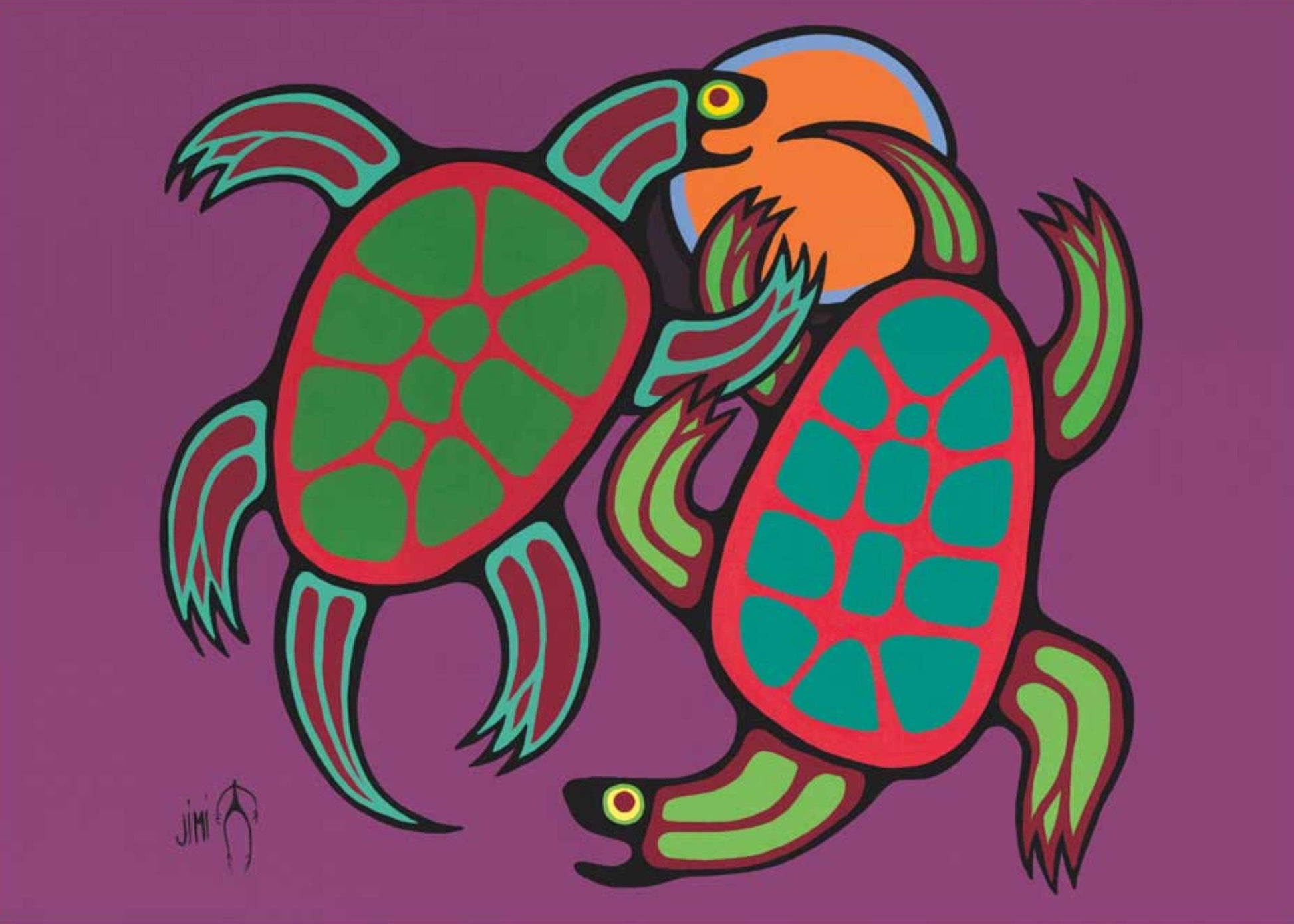Jim Oskineegish is an Ojibwe artist who is a registered member of the Eabametoong First Nation which is located in northwestern Ontario, Canada. Jim paints in the Shamanistic Woodland Style using bold lines and bright colors. He loves to paint legends and stories of his people and hopes that his art can bridge a universal understanding of love, faith, and unity. “I want to promote positive Ahnisnabae culture to the world.”