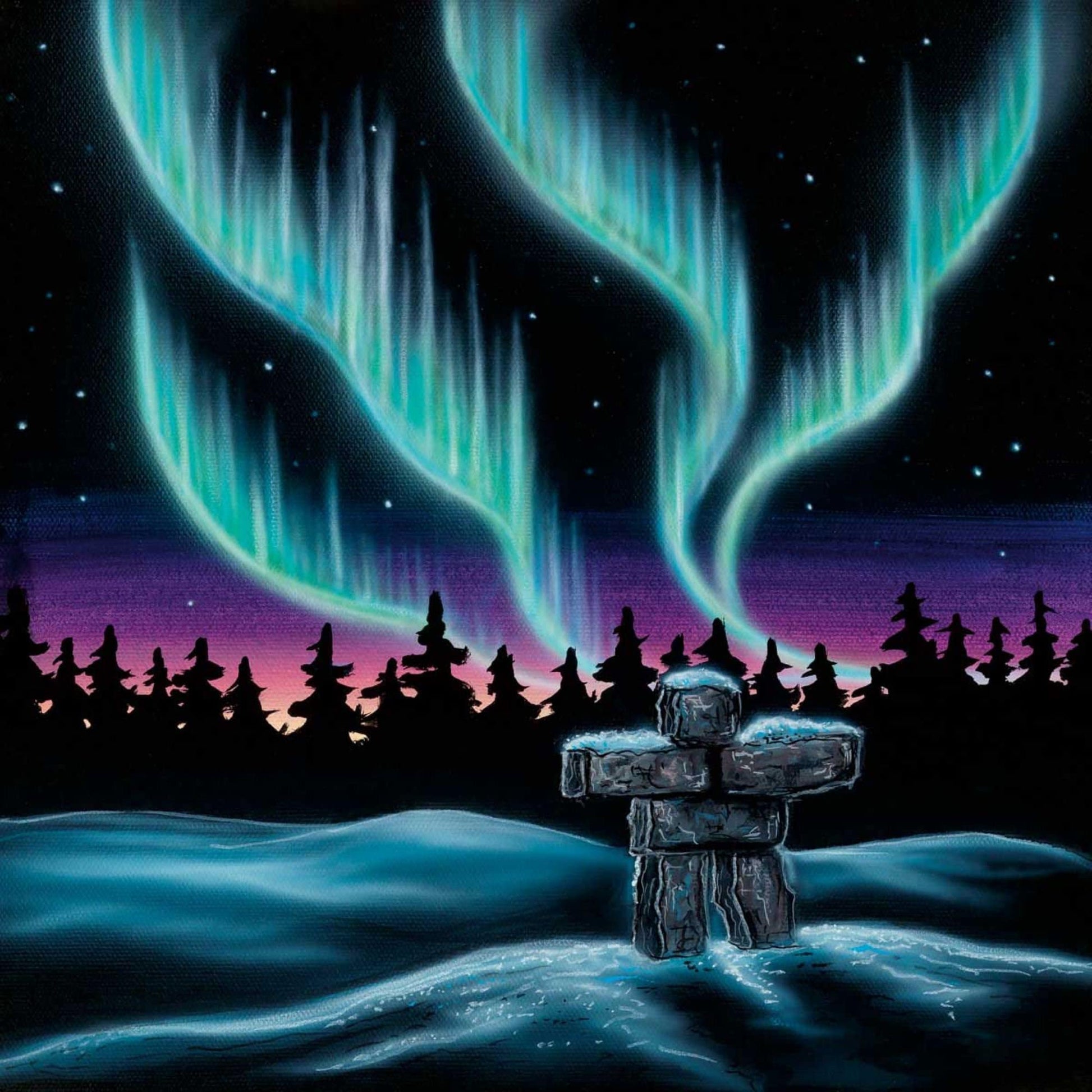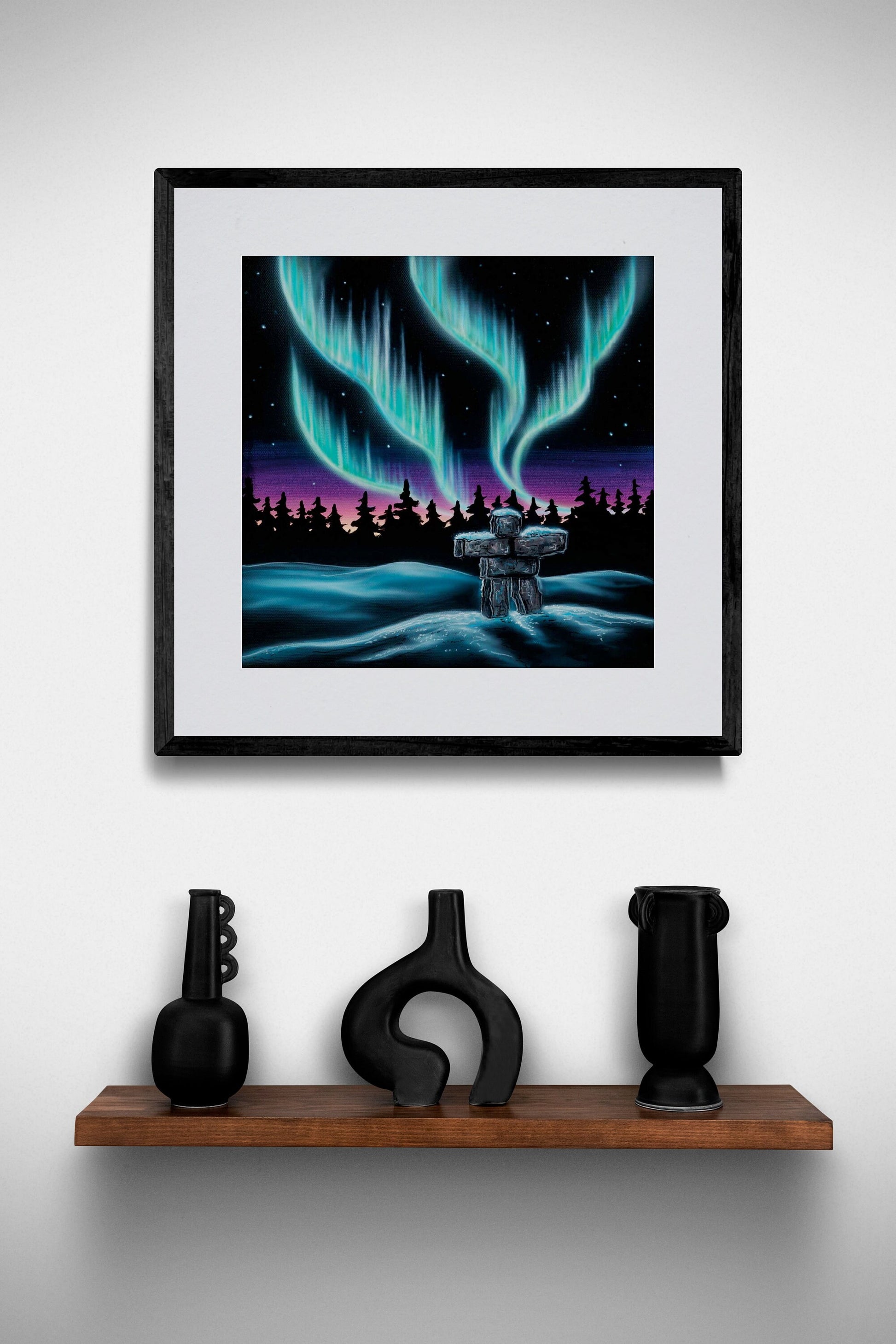 Sky Dance – Inukshuk By Amy Keller-Rempp Indigenous Art Print, First Nations, Native Americans, Northern Lights, Aurora Borealis