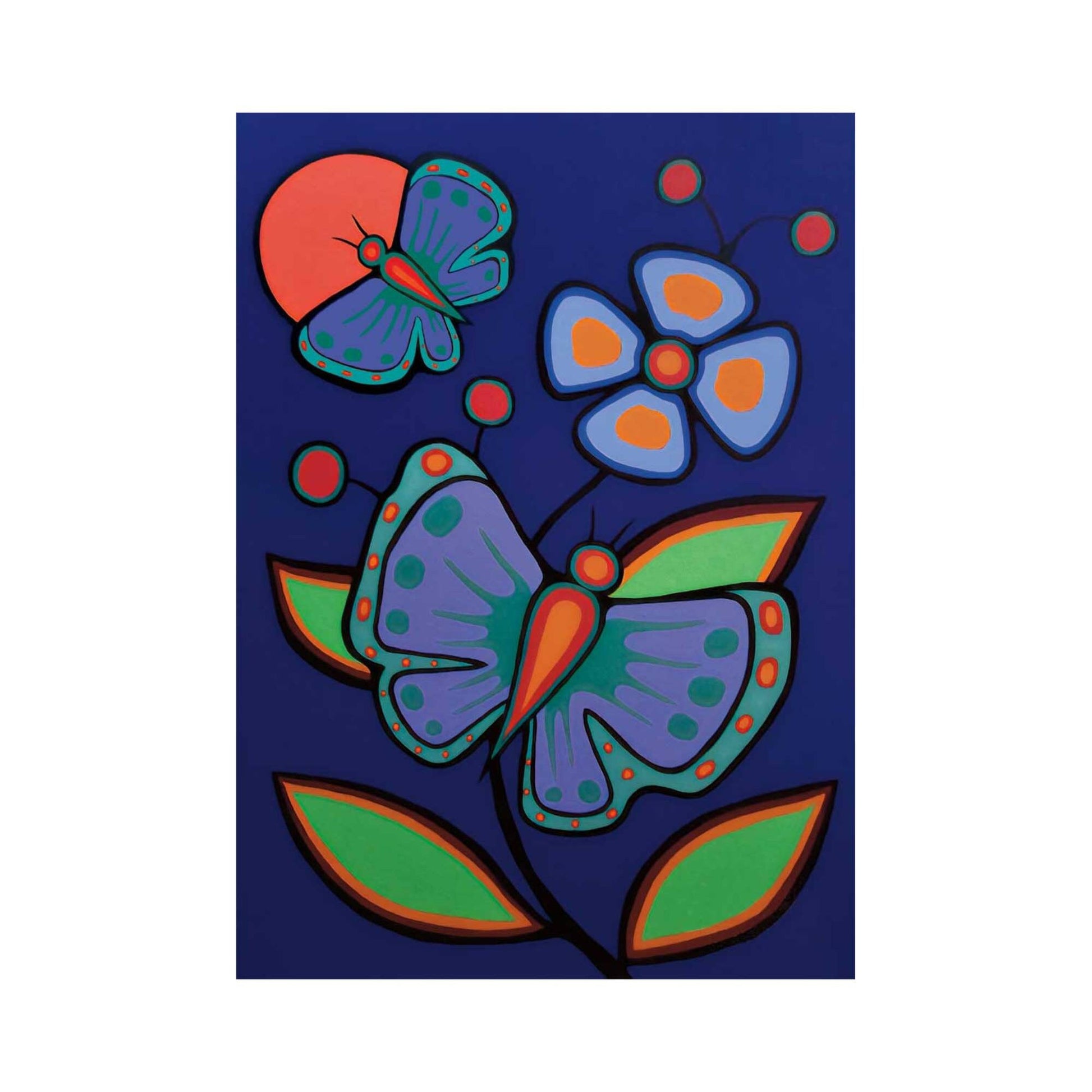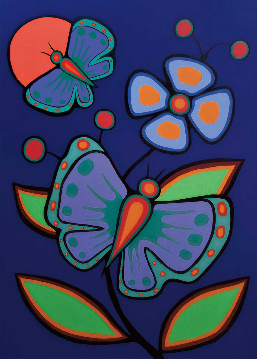 Jim Oskineegish is an Ojibwe artist who is a registered member of the Eabametoong First Nation which is located in northwestern Ontario, Canada. Jim paints in the Shamanistic Woodland Style using bold lines and bright colors. He loves to paint legends and stories of his people and hopes that his art can bridge a universal understanding of love, faith, and unity. “I want to promote positive Ahnisnabae culture to the world.”