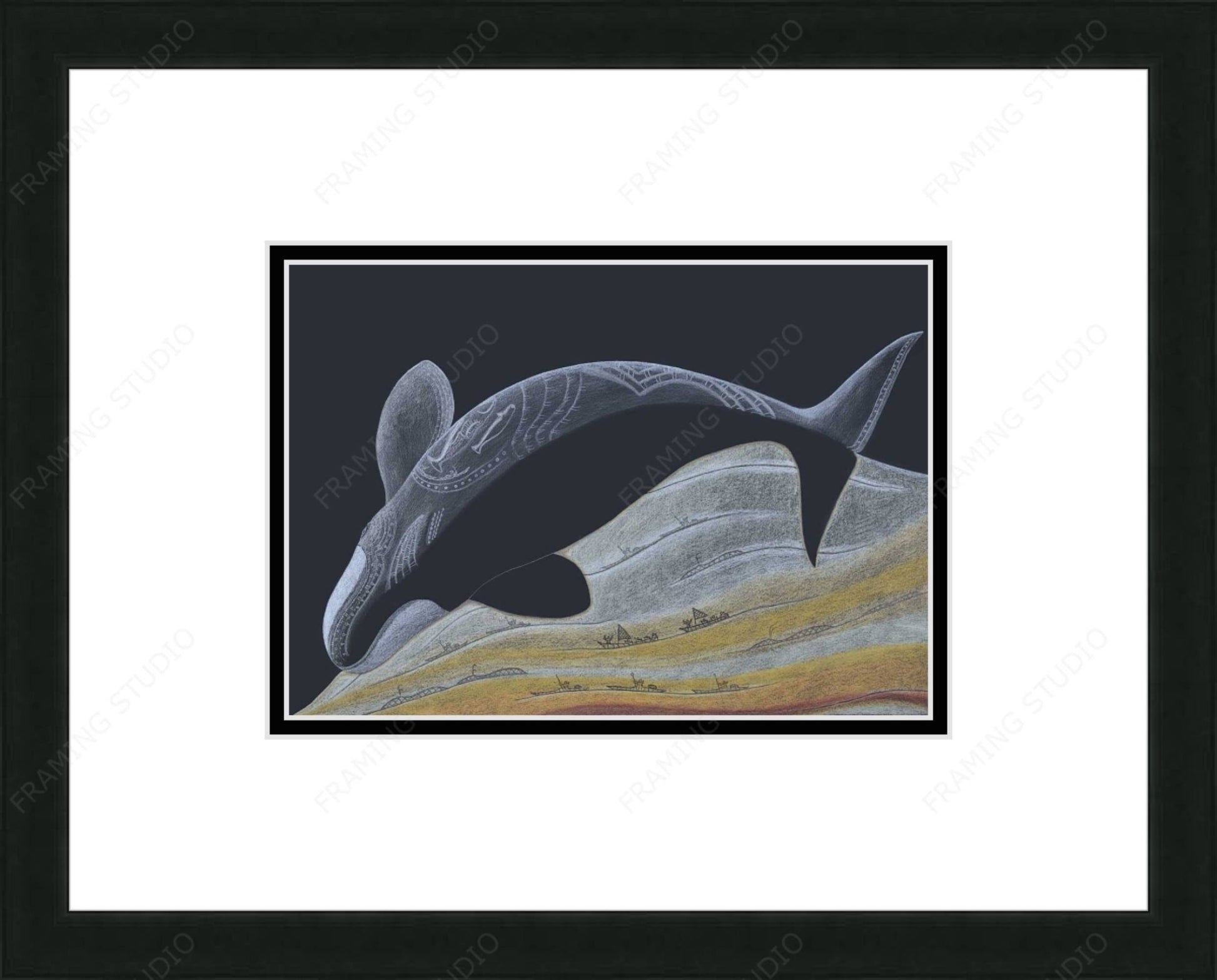 Framed Outside Finished Size: 16 X 13, Double Mat, 1.25” Black Wood Frame, Finished Backing with Wire Hanger and Artist's bio on the back.