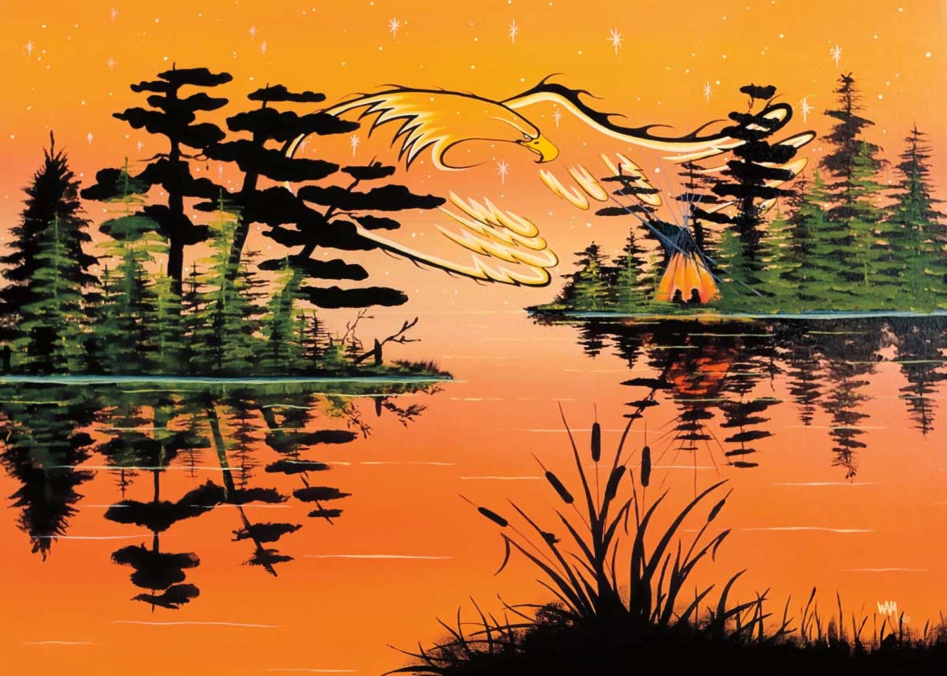 The self-taught Beausoleil First Nation artist, William Anthony Monague, grew up on an isolated island with no access to formal education or training in the arts. Monague – “Abwaudung” (The Visionary or Dreamer) discovered inspiration in the traditional teachings of Mother Earth, Spirit World and in the beauty of nature and in the Georgian Bay shores that surrounded him. Initially he was using the woodland style but soon developed his own more contemporary style of art. During the 1970’s and 80’s Monague followed the Pow Wow circuit in a van with his family down to Mexico. His work ended up in various museums and galleries along the way. Monague donates his time and artwork to many worthwhile causes, while helping others. “I feel my art speaks to my culture. I have made a name for myself with my work and reputation but it has taken a long time.” After 45 years of painting, he continues his artistic lifelong journey with his family.
