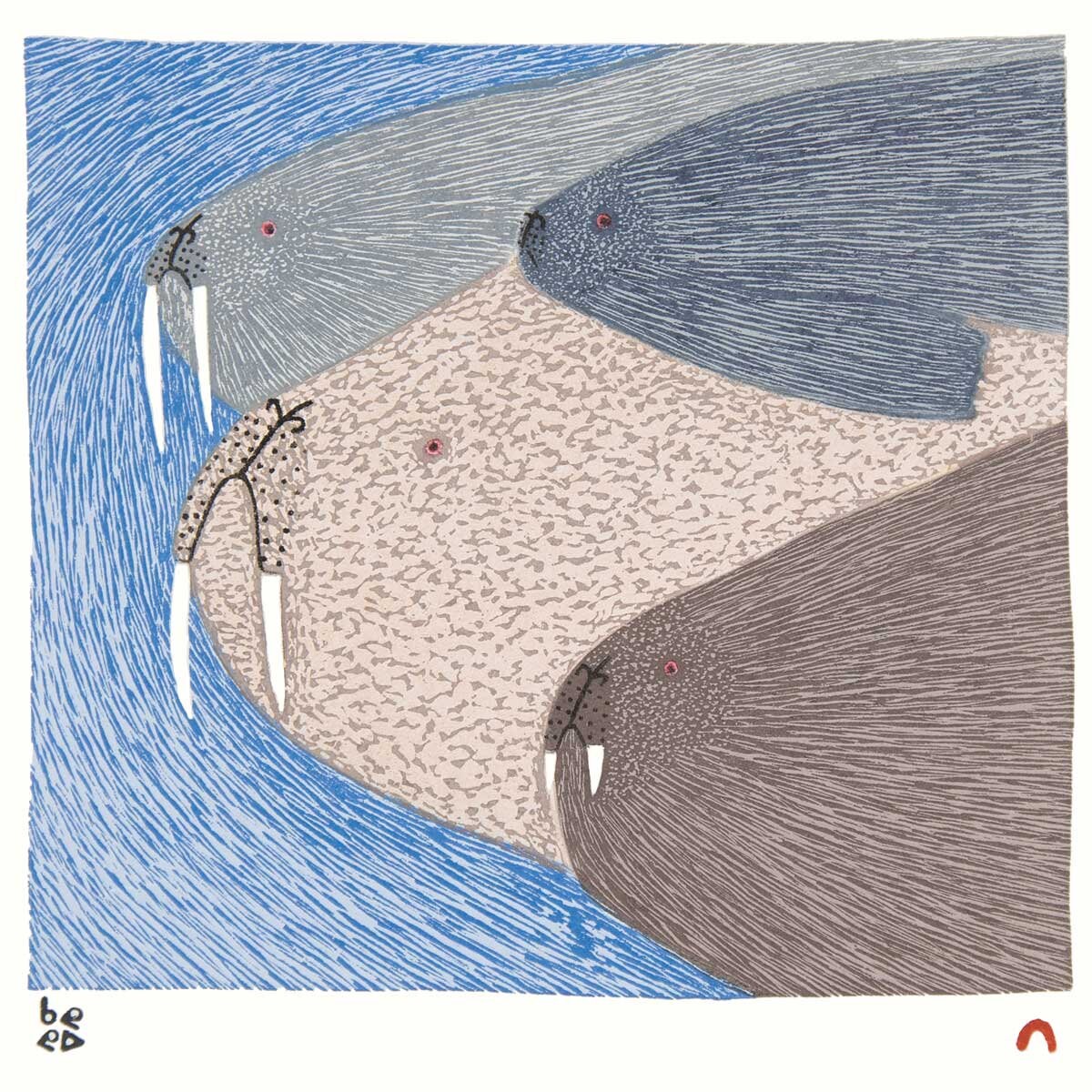 Born May 27, 1963, Ningeokuluk is one of the most versatile and intelligent graphic artists to emerge from the Kinngait Studios. In 2009, Ningeokuluk’s first children’s book was published by Groundwood Books (A Division of House of Anansi Press). Entitled Alego, it is an autobiographical story of a young girl named Alego who goes clam digging with her grandmother for the first time. The book was short-listed for the Governor General’s Literary Award for children’s illustration.