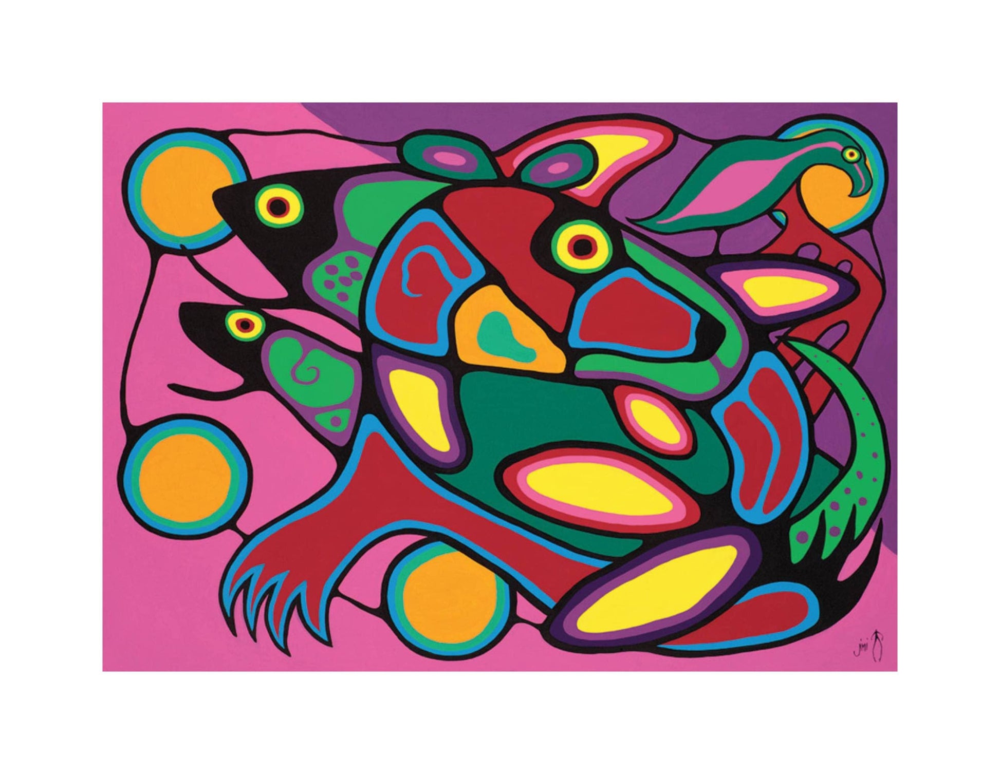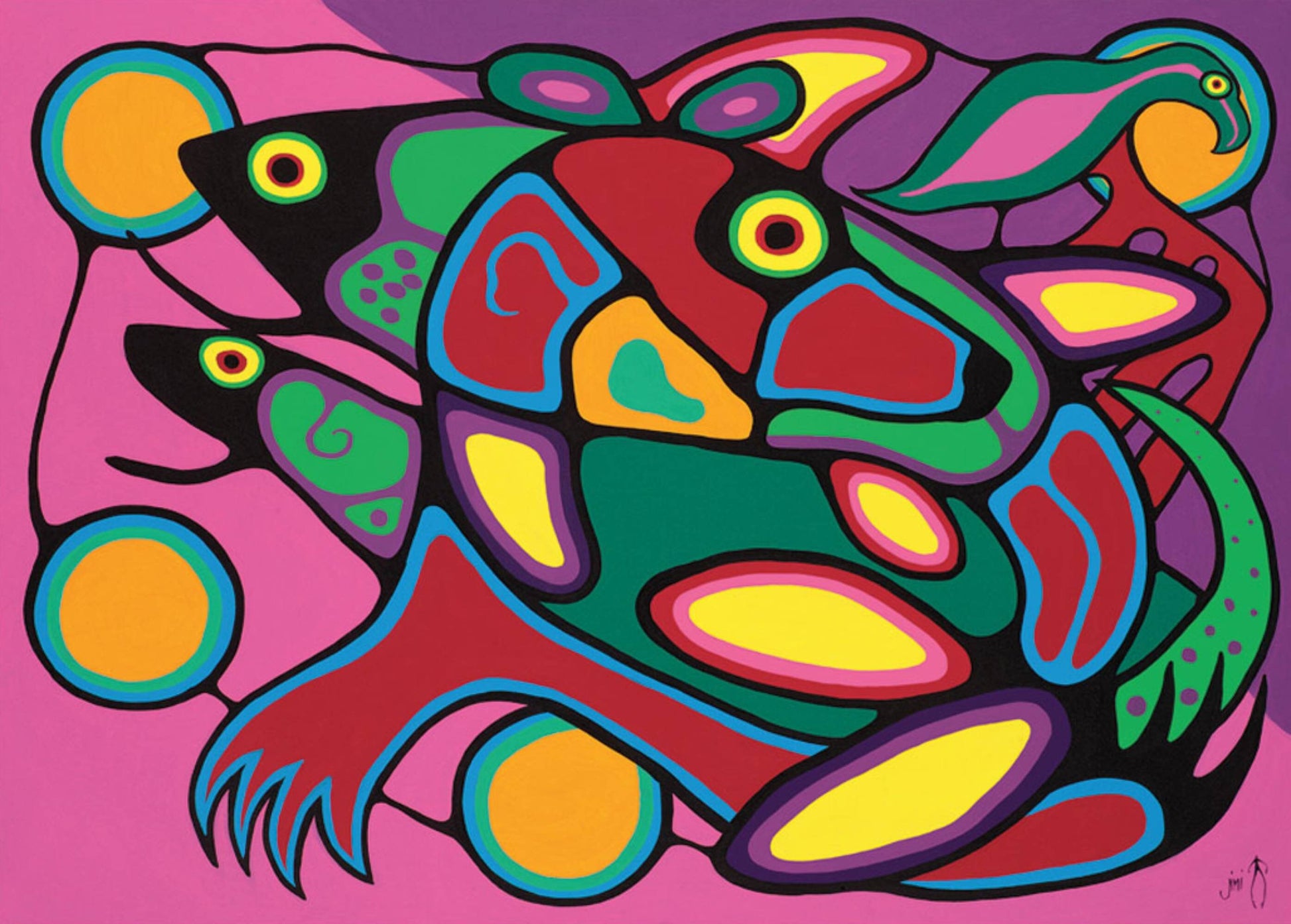 Jim Oskineegish is an Ojibwe artist who is a registered member of the Eabametoong First Nation which is located in northwestern Ontario, Canada. Jim paints in the Shamanistic Woodland Style using bold lines and bright colors. He loves to paint legends and stories of his people and hopes that his art can bridge a universal understanding of love, faith, and unity. “I want to promote positive Ahnisnabae culture to the world.”