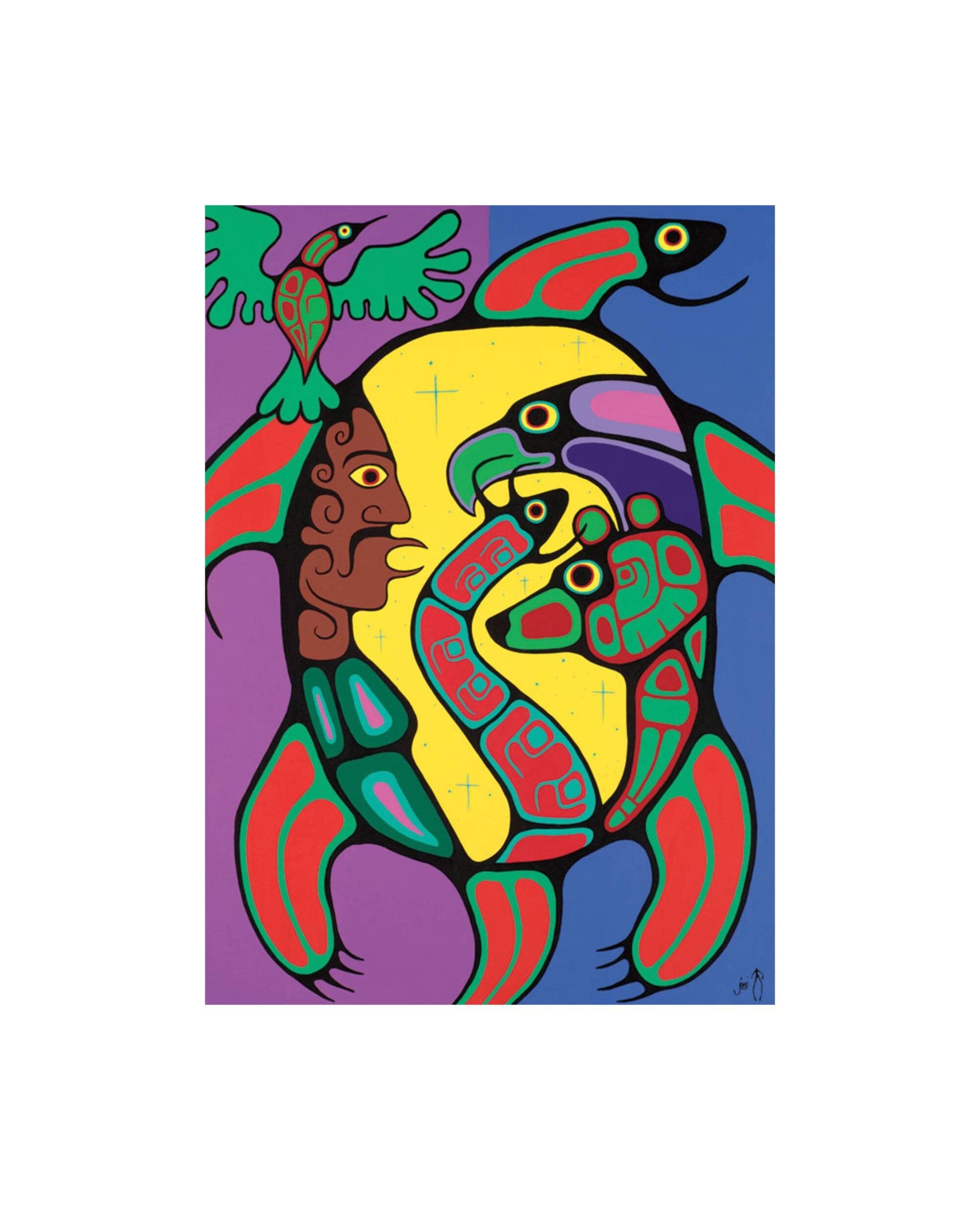 Jim Oskineegish is an Ojibwe artist who is a registered member of the Eabametoong First Nation which is located in northwestern Ontario, Canada. Jim paints in the Shamanistic Woodland Style using bold lines and bright colors. He loves to paint legends and stories of his people and hopes that his art can bridge a universal understanding of love, faith, and unity. “I want to promote positive Ahnisnabae culture to the world.”