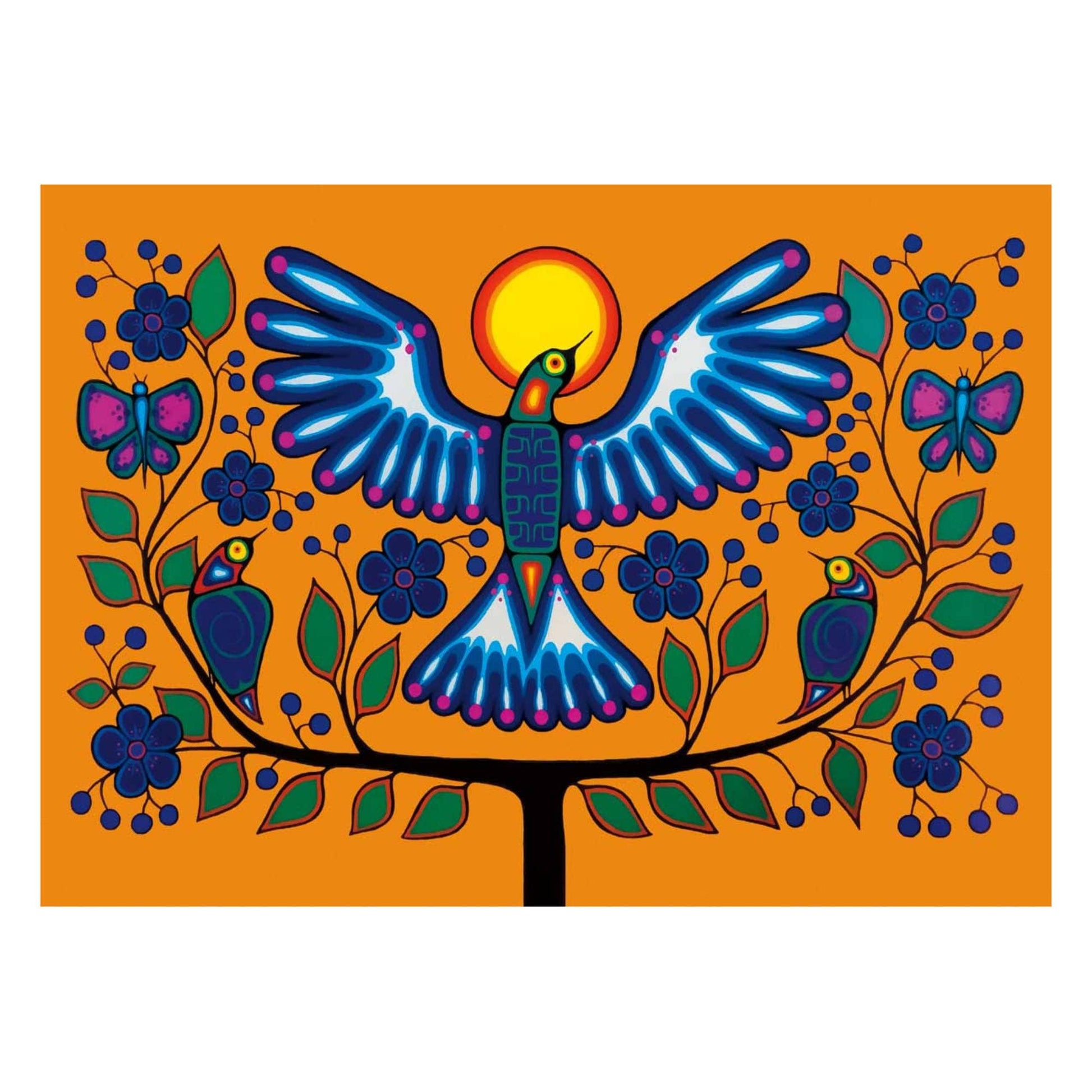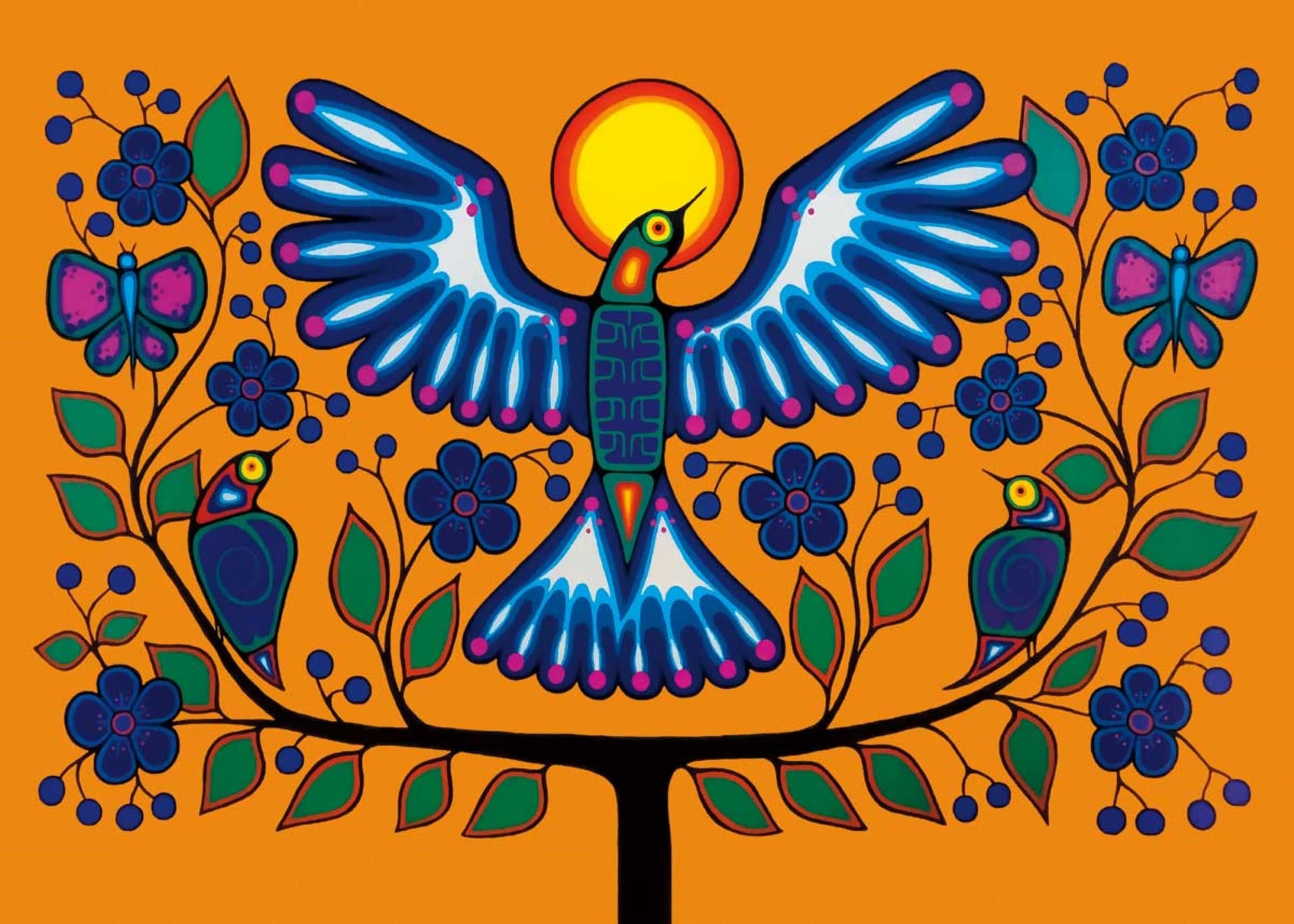 Jim Oskineegish is an Ojibwe artist who is a registered member of the Eabametoong First Nation which is located in northwestern Ontario, Canada. Jim paints in the Shamanistic Woodland Style using bold lines and bright colors. He loves to paint legends and stories of his people and hopes that his art can bridge a universal understanding of love, faith, and unity. “I want to promote positive Ahnisnabae culture to the world.”
