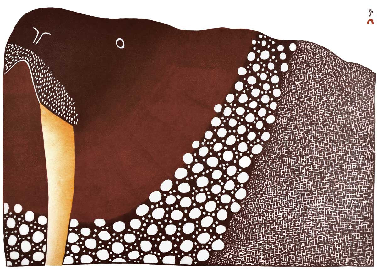 Born May 27, 1963, Ningeokuluk is one of the most versatile and intelligent graphic artists to emerge from the Kinngait Studios. In 2009, Ningeokuluk’s first children’s book was published by Groundwood Books (A Division of House of Anansi Press). Entitled Alego, it is an autobiographical story of a young girl named Alego who goes clam digging with her grandmother for the first time. The book was short-listed for the Governor General’s Literary Award for children’s illustration.