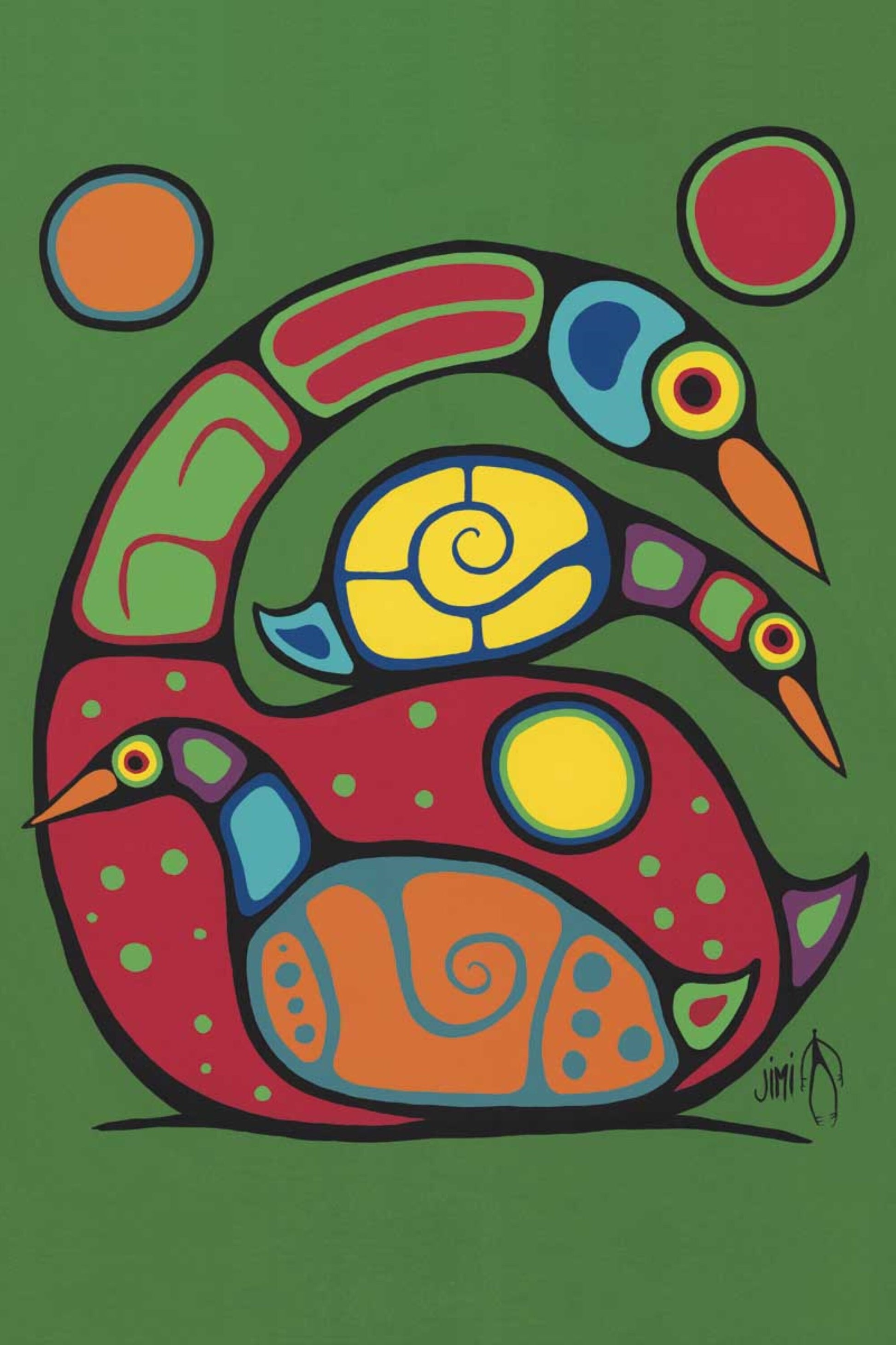 Jim Oskineegish is an Ojibwe artist who is a registered member of the Eabametoong First Nation which is located in northwestern Ontario, Canada. Jim paints in the Shamanistic Woodland Style using bold lines and bright colors. He loves to paint legends and stories of his people and hopes that his art can bridge a universal understanding of love, faith, and unity. “I want to promote positive Ahnisnabae culture to the world.”